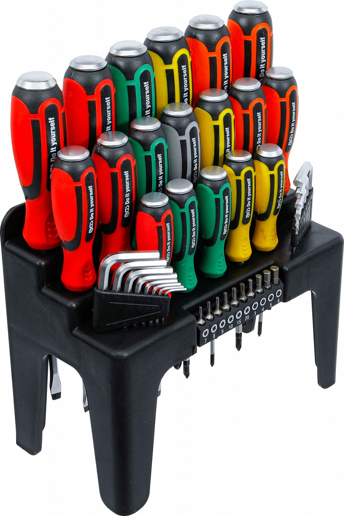 Kompaktni set izvijačev s šestkotnimi rezili, črnimi konicami, kapami za udarce in zaščito pred kotaljenjem, v stojalu. Vsebina: širok spekter SL, PH, PZ, Torx, L-ključi, nastavki in ročaj