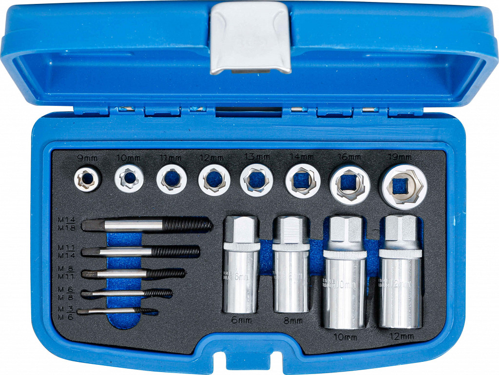 Komplet za odstranjevanje poškodovanih vijakov in matic, rešuje težave z zaobljenimi ali odlomljenimi vijaki, vsebuje 5 izvlečnih nastavkov z levim navojem, 4 nasadne ključe 6–12 mm z vpenjalno napravo ter 8 posebnih nasadnih ključev za zaobljene matice 9–19 mm.