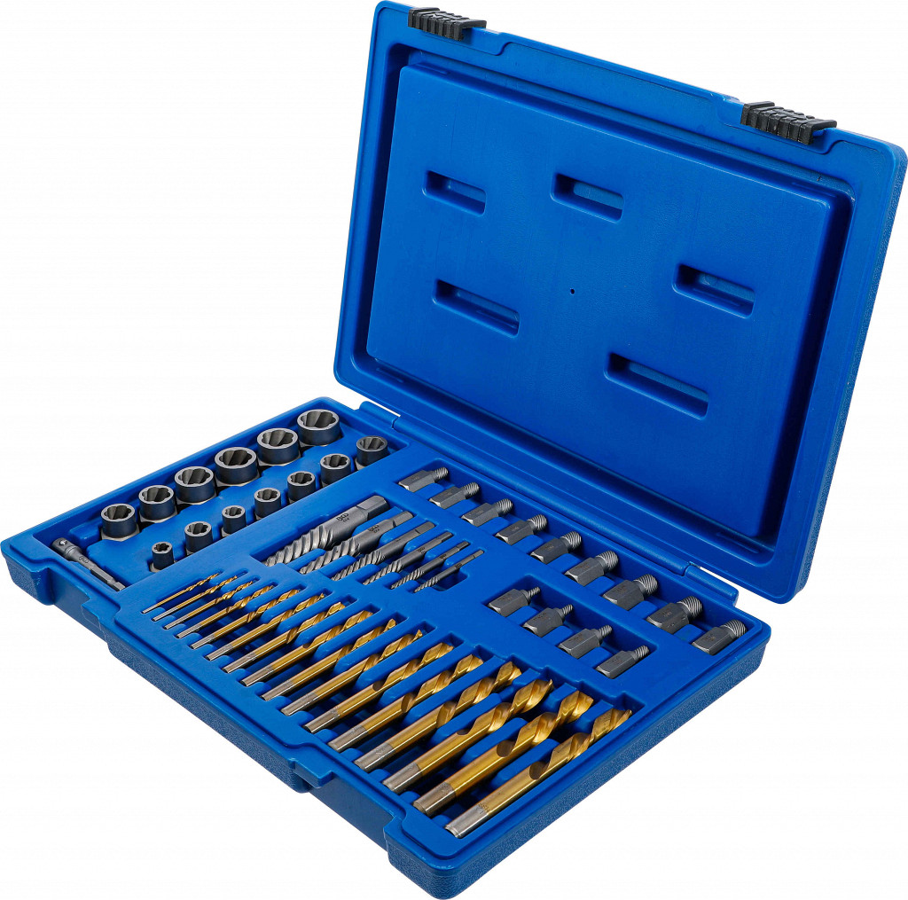Kompakten set za odvijanje poškodovanih vijakov, čepov in matic, vsebuje 13 izvlečnih nasadnih ključev z levim navojem za poškodovane matice (notranji kvadrat), 13 izvlečnih nasadnih ključev (zunanji šesterokot), 6 izvlečnih nastavkov za zlomljene vijake (zunanji kvadrat), 16 HSS svedrov z levim rezanjem ter adapter za električni vrtalnik.