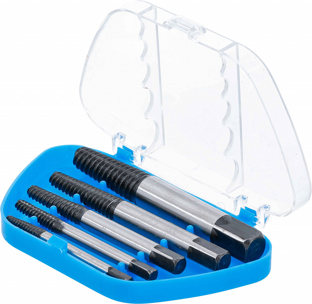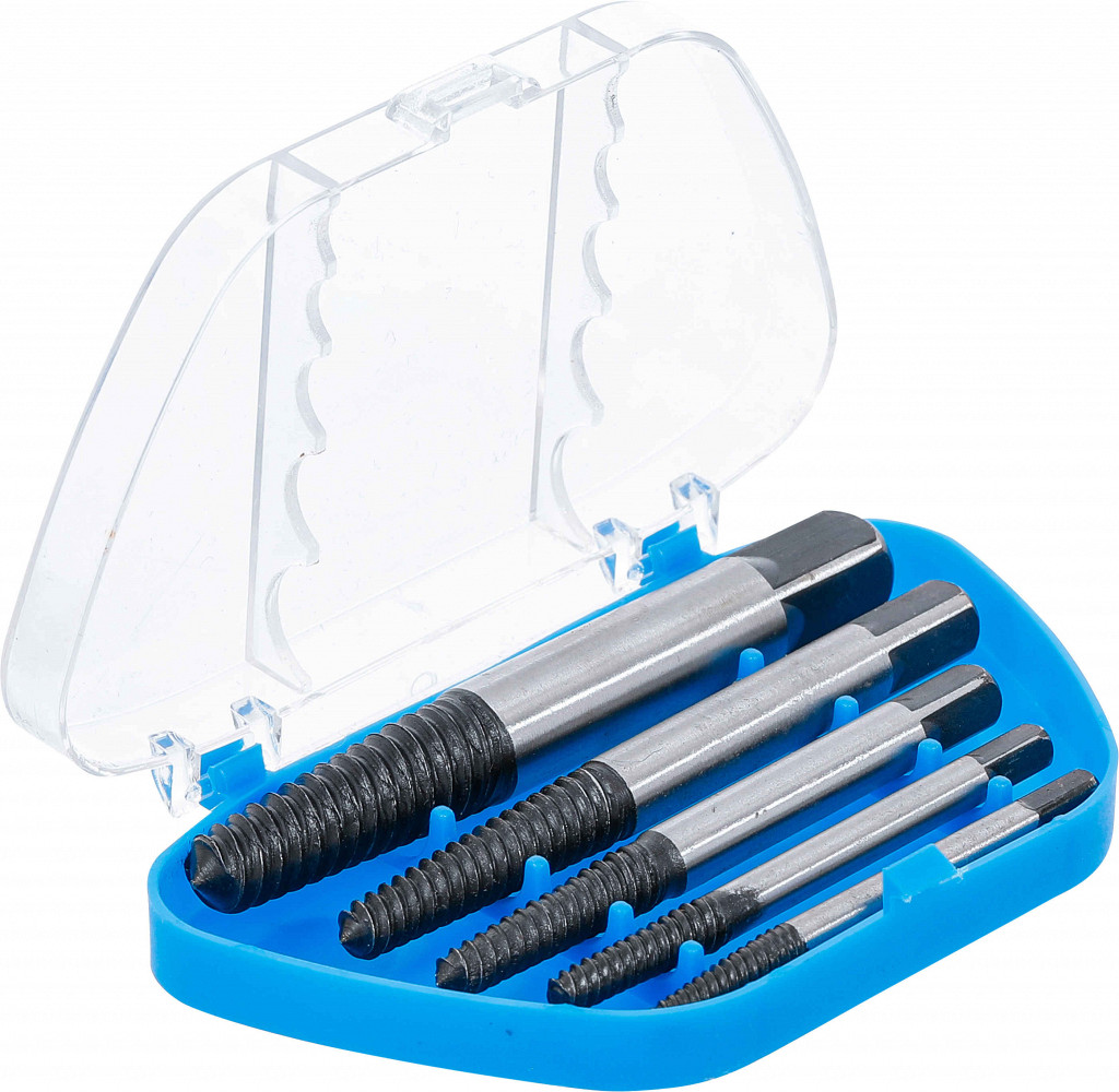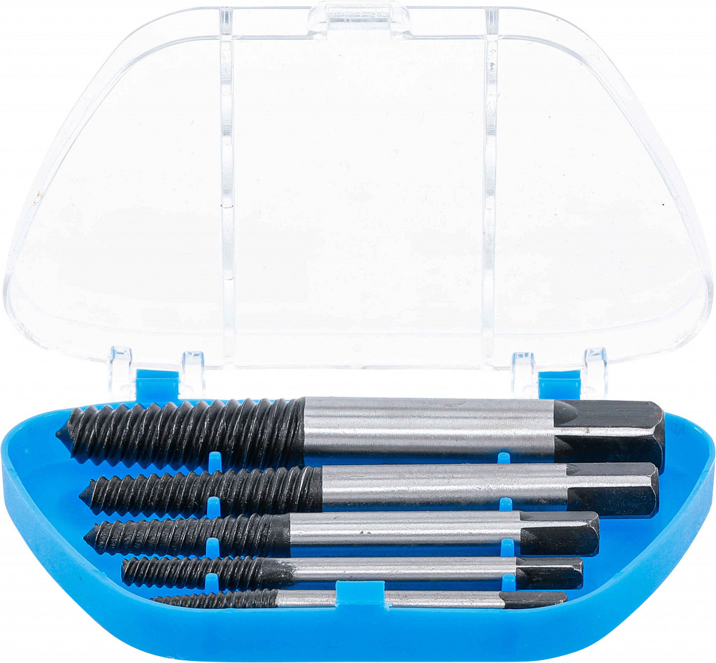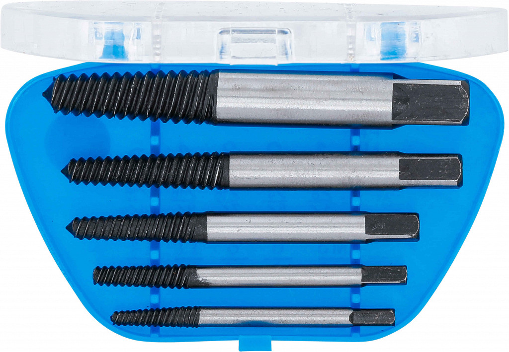 Za odstranjevanje polomljenih vijakov in čepov, ogljikovo jeklo, v plastičnem kovčku. Primerno za naslednje velikosti vijakov: 3 - 6 mm (1/8" - 1/4"), 6 - 8 mm (1/4" - 5/16"), 8 - 11 mm (5/16" - 7/16"), 11 - 14 mm (7/16" - 9/16"), 14 - 19 mm (9/16" - 3/4").