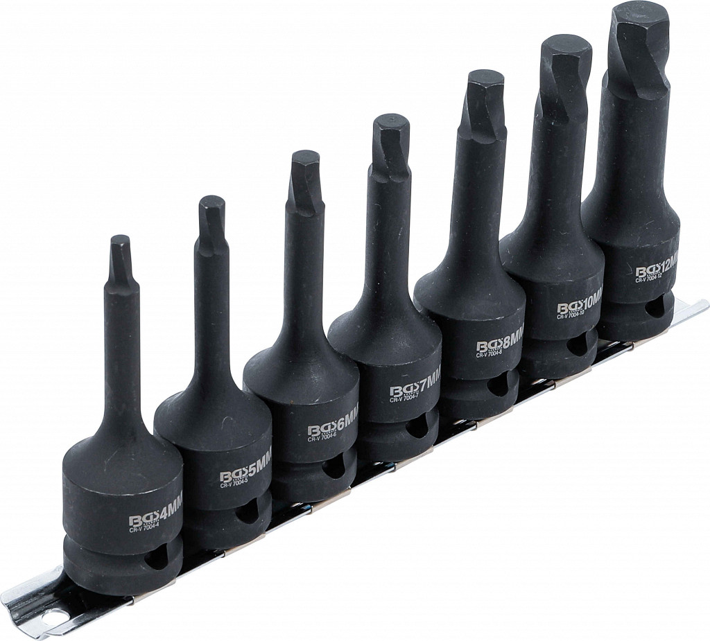 Set izvijačev za poškodovane imbus vijake, varno odvijanje poškodovanih profilov s posebnim levičnim stožčastim navojem. Na kovinskem nosilcu. Vsebina: 6 izvlečkov 4–12 mm, 12,5 mm (1/2") pogon, dolžina 78 mm.