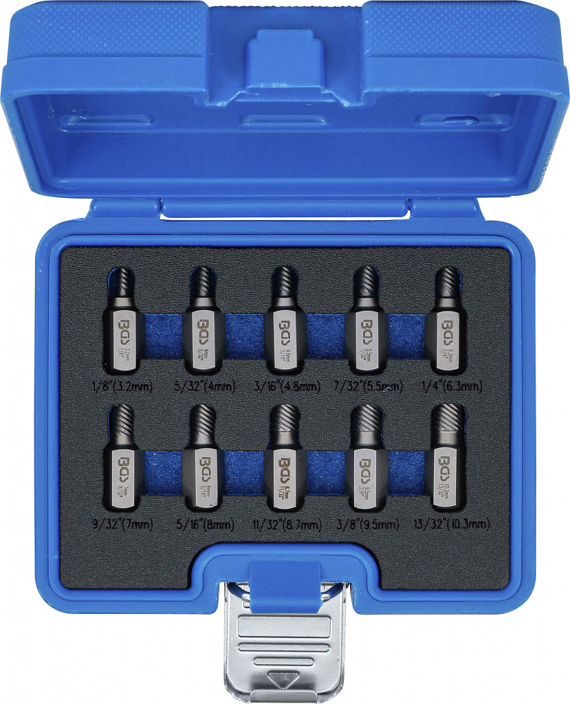 Izvlečni nastavki za odstranjevanje vijakov s poškodovano glavo, primerni za imbus, Torx in spline vijake, velikosti 3–11 mm ter inch mere od 1/8" do 13/32", z 13 mm šesterokotnim vpetjem.