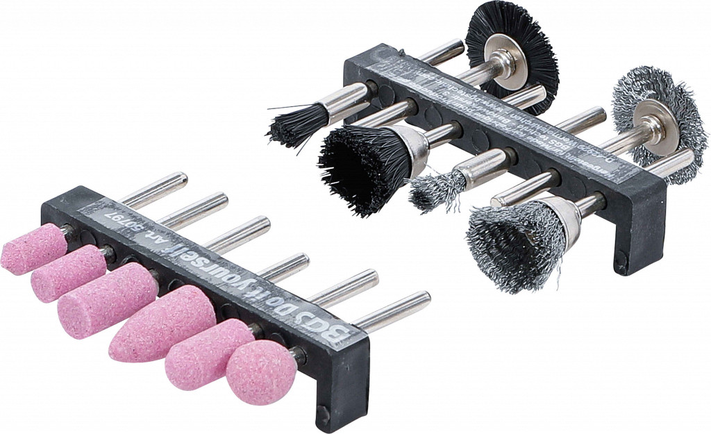 Set krtač in brusov za čiščenje in raziglevanje jekla, navojev, valjev, puš, cevi in drugih kosov, primeren tudi za površinsko obdelavo, ščetine iz najlona in jeklene žice, brusni nastavki iz aluminijevega oksida različnih oblik (valj, stožec, krogla, konica), za uporabo z vrtalniki in električnimi izvijači