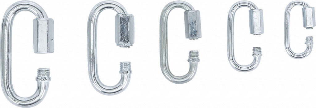 Komplet verigastih členov: 6 kosov 36 x 17 mm Ø 3,5 mm, 4 kosov 40 x 20 mm Ø 4 mm, 4 kosov 49 x 23 mm Ø 5 mm, 2 kosova 58 x 27 mm Ø 6 mm, 2 kosova 65 x 31 mm Ø 7 mm, 2 kosova 75 x 34 mm Ø 8 mm.