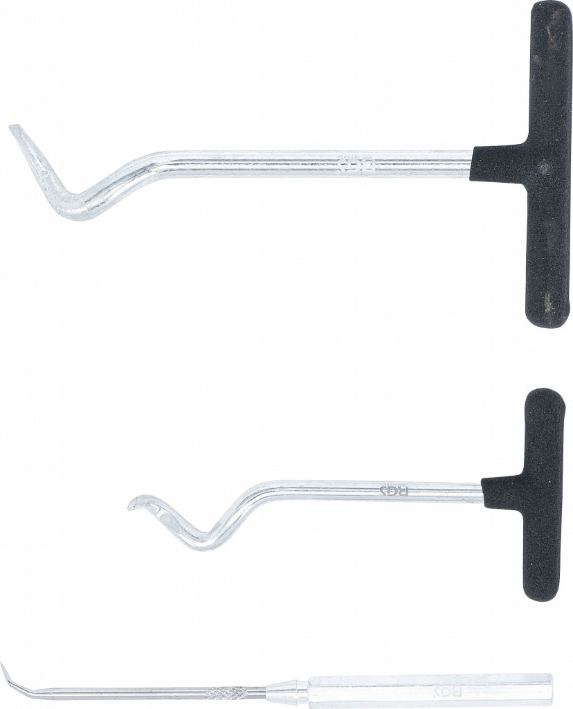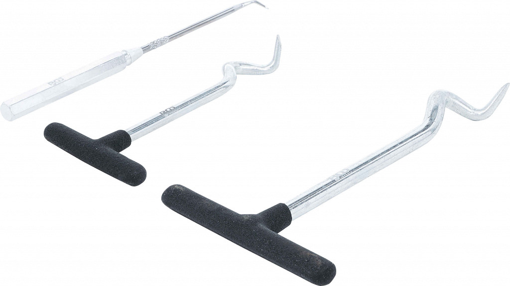 Set kavljev: S-kavlji za odstranjevanje tesnil gredi, 90° kavlji za O-tesnila in majhno orodje s kavljem.