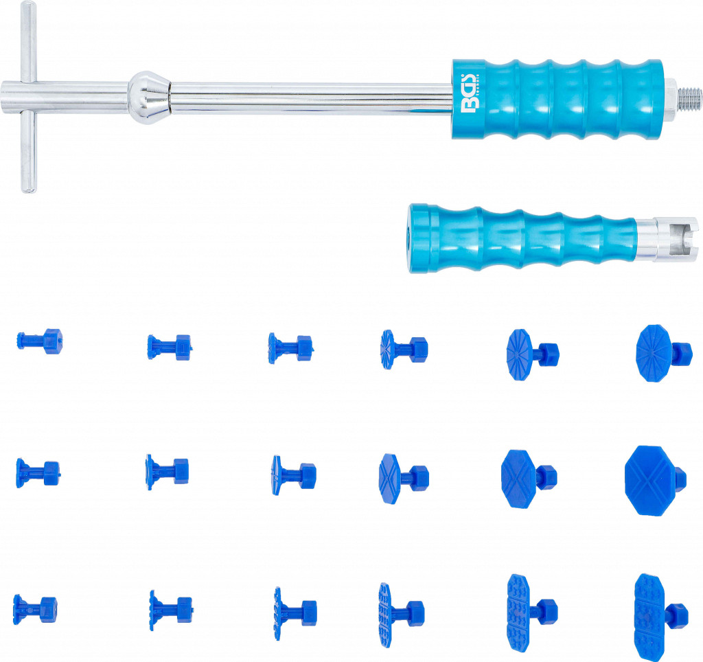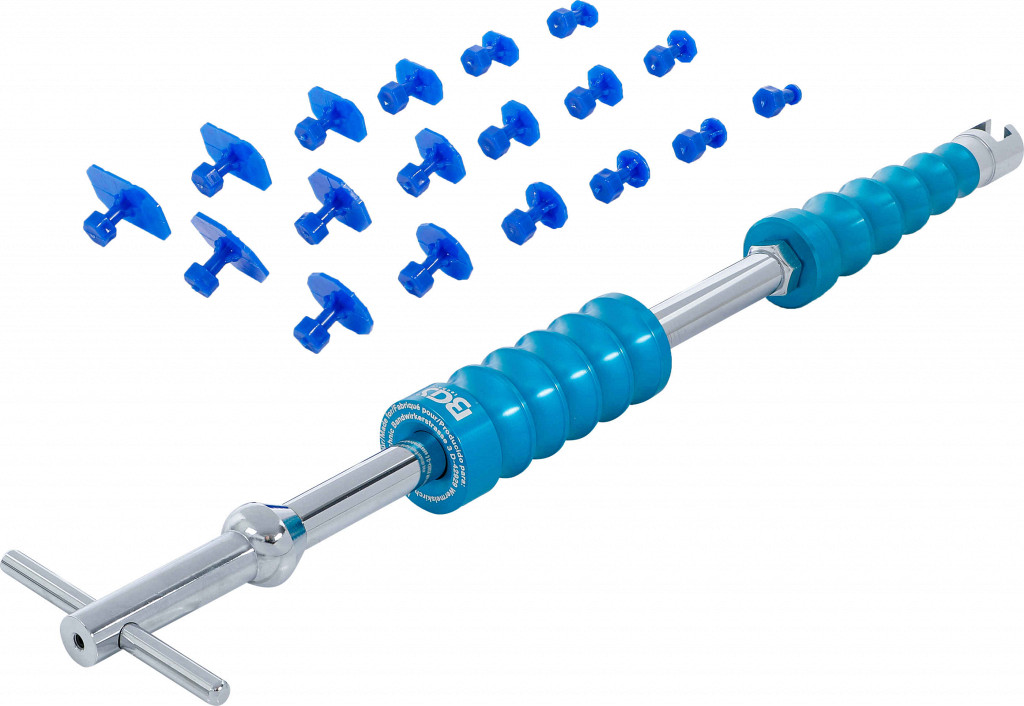 Drsno kladivo 460 mm z glavo za adapterje, teža drsnega kladiva do 180 g, navoj adapter glave M12 x 1,75, izdelano iz anodiziranega aluminija, priložene blazinice: okrogle izbočene Ø 15 - 20 - 25 mm, okrogle ravne Ø 32 - 36 - 42 mm, ovalne ravne 23 x 34 - 28 x 41 - 33 x 48 mm, pravokotne ravne 20 x 30 - 23 x 35 - 32 x 49 mm.