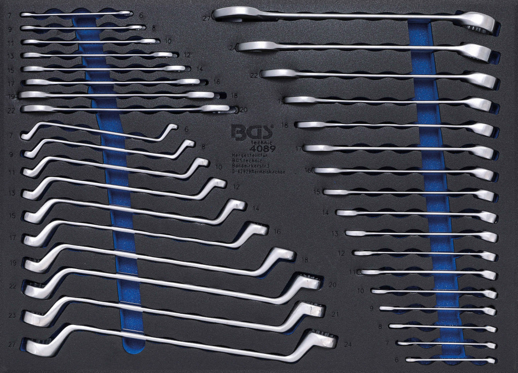 Kovan komplet; zamaknjeni obročni ključi. Vsebina: 8 vilastih ključev 6x7–20x22 mm; 17 kombiniranih ključev 6–27 mm; 10 dvostranskih obročnih ključev z...