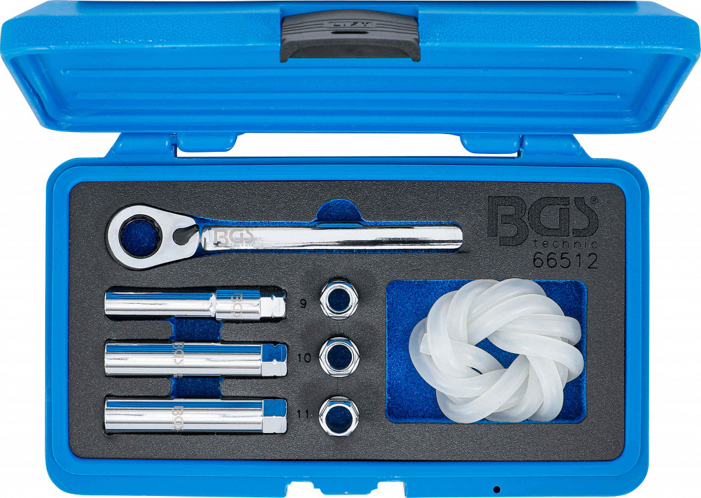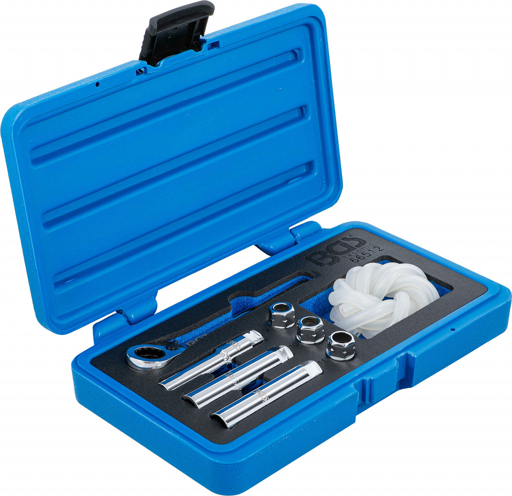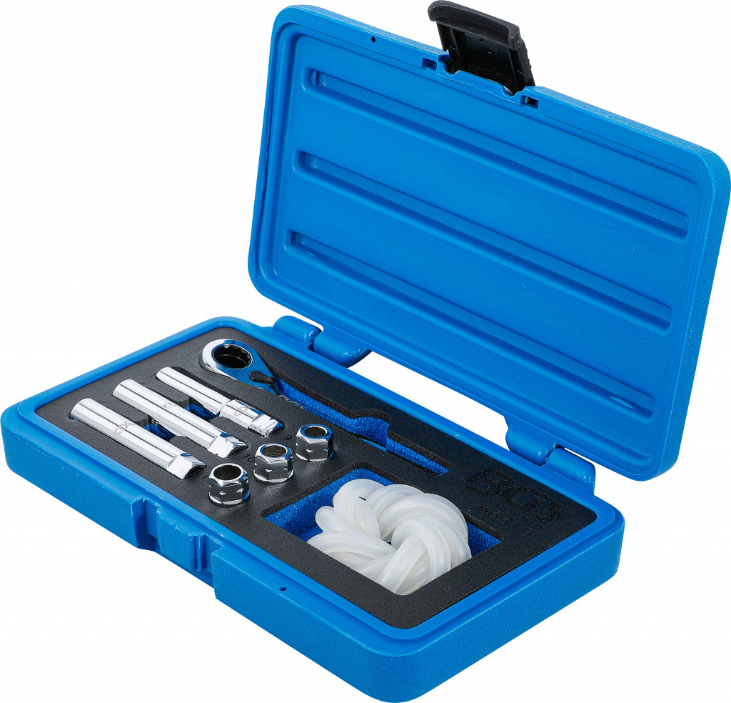 Komplet za enostavno odzračevanje zavornih sistemov brez odstranitve koles. Raglja olajša delo, cev ostane pritrjena med odvijanjem. Vključuje 6 specialnih nasadnih ključev in cev za odzračevanje.