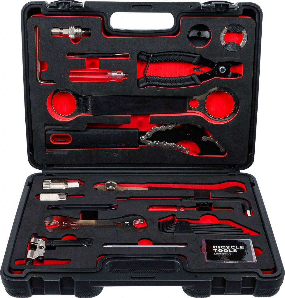 Univerzalna sestava kompletdobro opremljen komplet orodij se lahko uporablja za izvajanje najpogostejših popravil in vzdrževalnih del na kolesuponuja hobi kolesarjem možnost, da sami opravijo vzdrževalna dela in manjša popravila na svojem kolesuidealno za doma ali za pojditeprimerno za cestna kolesa, športna kolesa, kot so dirkalna kolesa in gorska kolesavarno in urejeno shranjevanje v ohišju za pihanjejasno razporeditev različnih orodij, da jih hitro najdete. Material: ogljikovo jeklo.Obseg dobave:... 2 ročnici za pnevmatike1 orodje za verižne zakovice | za 7 do 12-stopenjske verige1 odstranjevalec zobnikov s kavljičnim ključem1 ležajni ključ z dvojno funkcijo za Shimano Hollowtech II ležajne lupine1 klešče za zaklepanje verige | 2-v-11 orodje za notranje ležaje z 1/2" priključkom in 24 mm vtičnico ključa za ležaje ISIS in Shimano1 kasetni ključ | s sredinskim zatičem1 univerzalni izvleček ročice za kvadratne ročice1 ključ tipa L | zelo dolg | notranji šesterokotnik 8 mm1 verižni ključ1 ročaj izvijaka3 L-ključi | T-Star (za Torx) T20 - T25 - T307 Ključi tipa L | zelo dolg | notranji šesterokotnik / notranji šesterokotnik s kroglo glavo 1,5 - 2,0 - 2,5 - 3,0 - 4,0 - 5,0 - 6,0 mm1 izvijač izmenljivo rezilo | Reža SL 6 mm, prečna reža PH2 | dolžina rezila 100 mm1 L-ključ 8 mm z adapterjem 1/2" za orodje z 1/2" nasadom1 komplet za popravilo1 izvijač | Reža SL 3 mm | dolžina rezila 75 mm3 stožčasti ključi z odprtino čeljusti 13/14 mm, 15/16 mm, 17/18 mm1 orodje z zvezdičastim pokrovčkom za ročice Hollowtech II1 ključ za pedal s širino čeljusti 14, 15 mm in vtičnim ključem 10 mm1 ključ za krake | 4 velikosti | 3,2 - 3,3 - 3,5 - 4 mm