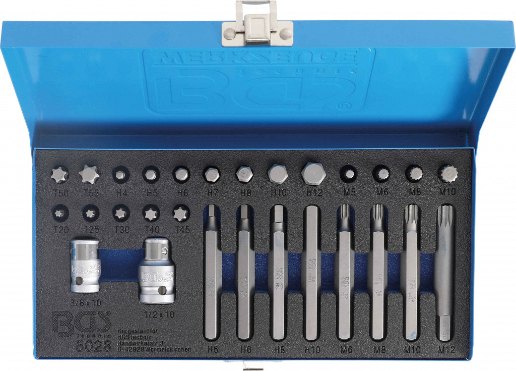 V kovinski škatli, obseg dobave: 7 kratkih šesterokotnih nastavkov 4–12 mm, 4 dolgih šesterokotnih 5–10 mm, 4 kratki XZN M5–M10, 4 dolgi XZN M6–M12, 7 Torx...