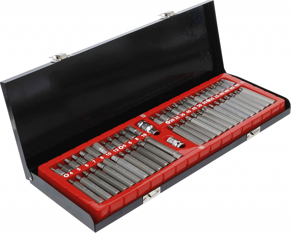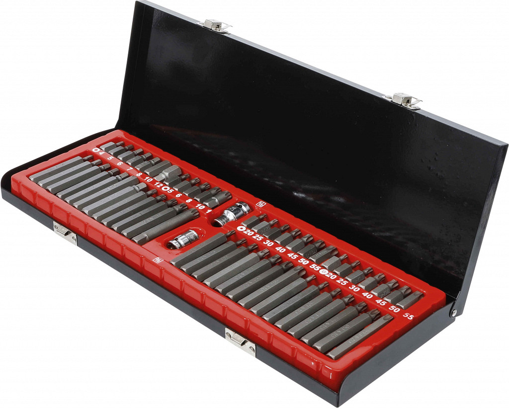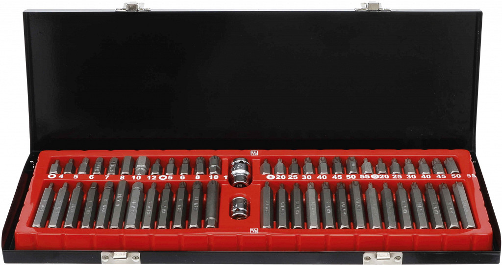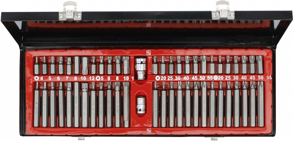 V kovinskem kovčku. Vsebina: 7 nastavkov dolžine 30 mm, notranji šesterokoti 4–12 mm, 7 nastavkov dolžine 75 mm, notranji šesterokoti 4–12 mm, 5 nastavkov dolžine 30 mm, XZN M5–M12, 5 nastavkov dolžine 70 mm, XZN M5–M12, 7 nastavkov dolžine 30 mm, Torx T20–T55, 7 nastavkov dolžine 70 mm, Torx T20–T55, 7 nastavkov dolžine 30 mm, varnostni Torx T20–T55, 7 nastavkov dolžine 70 mm, varnostni Torx T20–T55, 1 adapter z varovalno kroglico 10 mm (3/8"), 1 adapter z varovalno kroglico 12,5 mm (1/2").