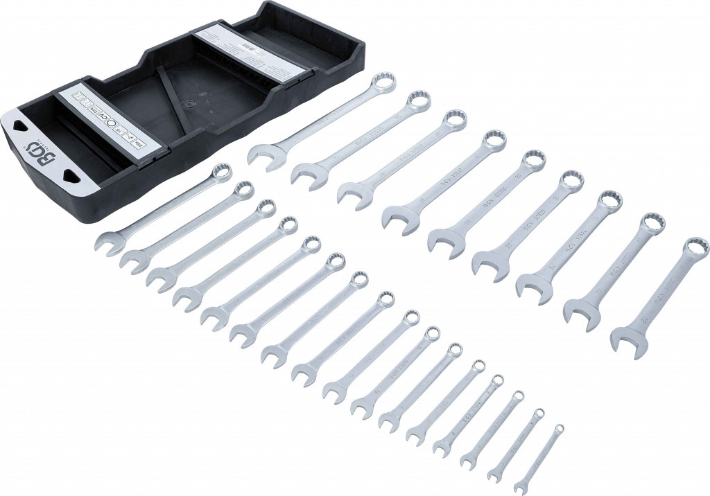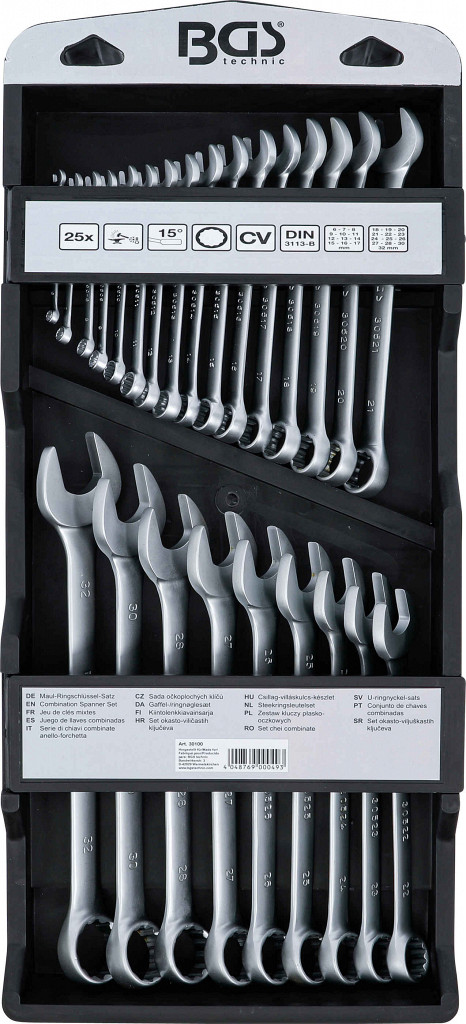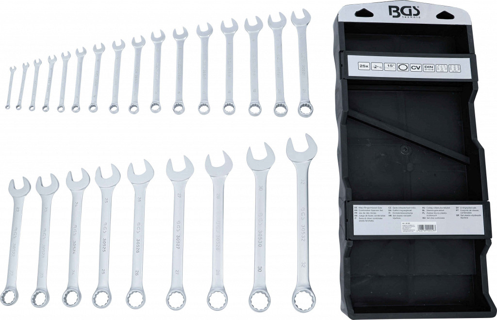 Hladno kovano, dolžina ključa. Obročna stran pod kotom 15°, 12-točkovna. Obseg dobave: kombinirani ključi 6 – 32 mm.