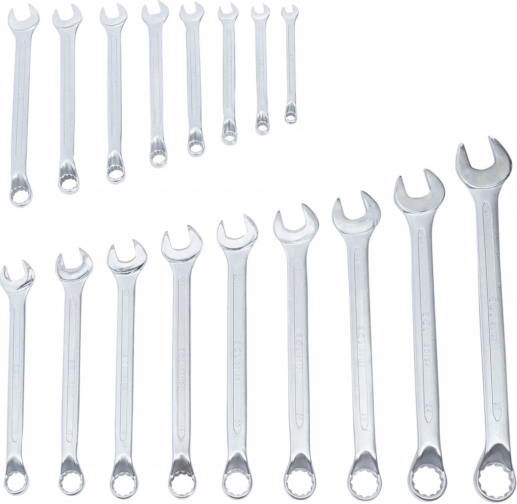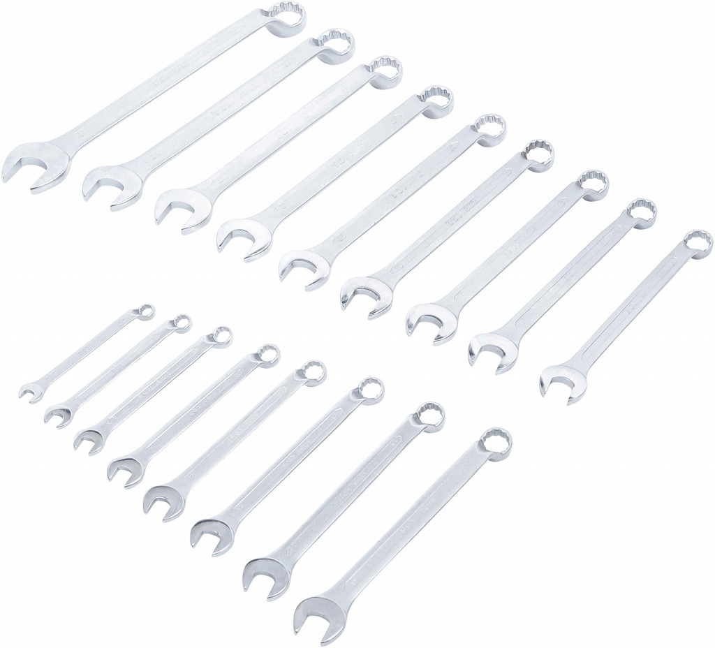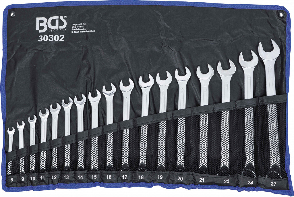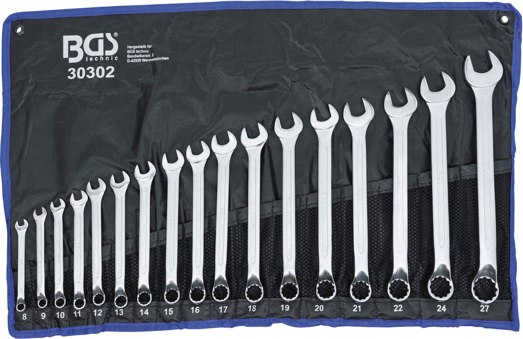 Hladno kovano, z globoko zamaknjenim obročnim koncem in 12-točkovnim profilom, pakirano v torbici iz tetronske tkanine. Vsebina: kombinirani ključ 8 mm, 9 mm, 10 mm, 11 mm, 12 mm, 13 mm, 14 mm, 15 mm, 16 mm, 17 mm, 18 mm, 19 mm, 20 mm, 21 mm, 22 mm, 24 mm, 27 mm.