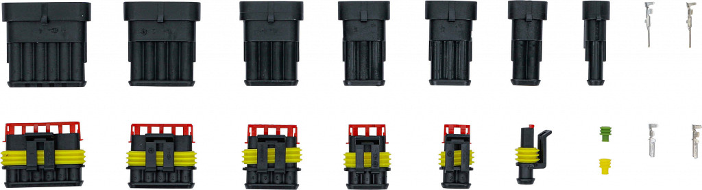 Komplet vodotesnih in prašno zaprtih električnih konektorjev za popravila in novo ožičenje. Vsebina: 50 zelenih tesnil F1.0 (Ø 1,2–1,8 mm), 50 rumenih tesnil F1.4 (Ø 1,6–2,4 mm), 50 moških in 50 ženskih kontaktov za preseke kablov 0,3–0,5 mm², 50 moških in 50 ženskih kontaktov za preseke kablov 0,85–1,25 mm², ohišja 1- do 6-polna, materiali: tesnila silikon Ø 6,1 mm, kontakti medenina, ohišja PA66+GF, temperaturno območje –40 °C do 120 °C.