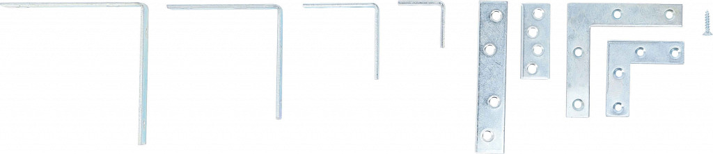 Vključuje vrtane plošče debeline 2 mm. 4 ravne plošče 40 x 15 mm4 ravne plošče 80 x 15 mm4 kotne plošče 25 x 25 x 16 mm4 kotne plošče 40 x 40 x 16 mm4 kotne plošče 60 x 60 x 16 mm4 kotne plošče 75 x 75 x 16 mm4 kvadrati 40 x 40 x 12 mm4 kvadrati 60 x 60 x 12 mm144 vijaki, križna reža PZ3 x 16 mm