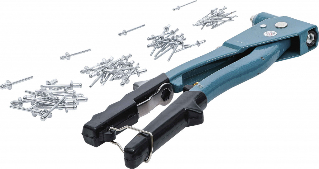 Zakovičnik težke kategorije. V kompletu je 60 različnih zakovic in 4 zamenljive konice za premer 2,4 / 3,2 / 4,0 / 4,8 mm. Posamezne slepe zakovice so na voljo kot BGS 75847, 75848, 75849, 88142. Dobavljivo v škatli.