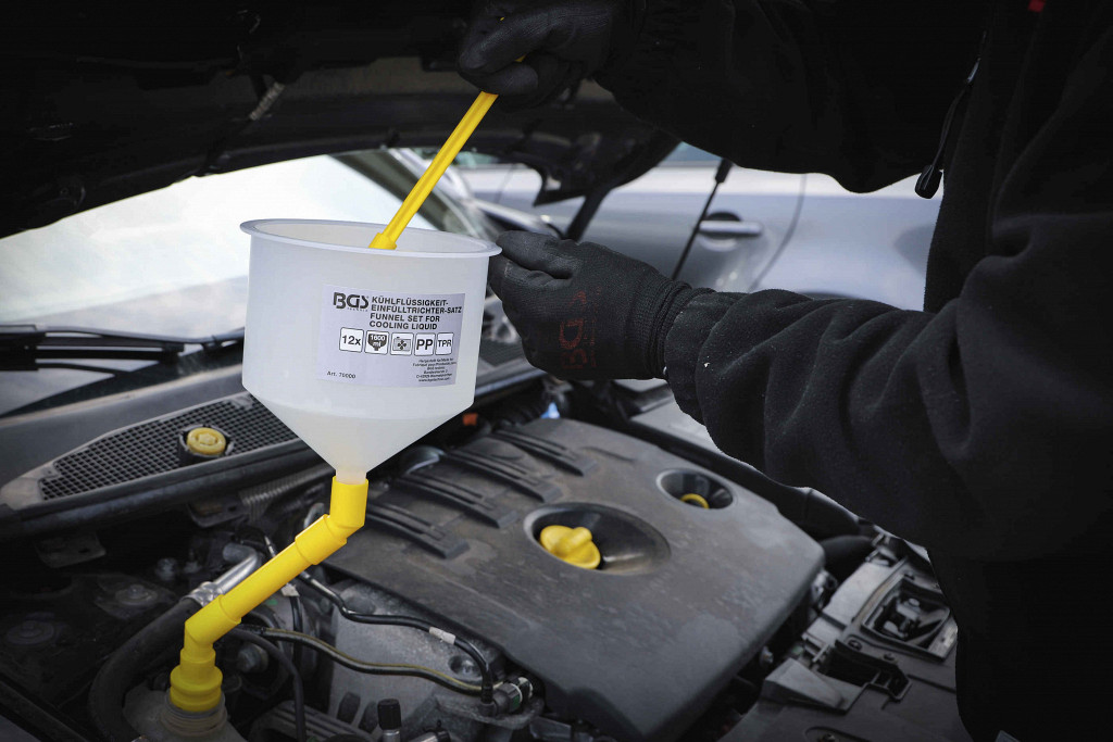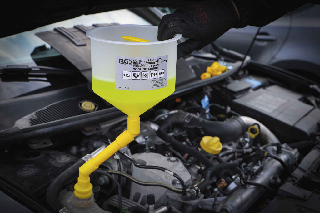 Prozoren lijak z veliko merilno skalo, primeren za hladilno tekočino, motorno olje in tekočino za pranje vetrobranskega stekla. Poseben mehanizem preprečuje nastajanje mehurčkov in omogoča enakomeren pretok. Vključuje adapterje in redukcije za različna vozila, podaljški omogočajo delo na težje dostopnih mestih. Z zaklepnimi pokrovi proti prahu, material PP in TPR plastika.