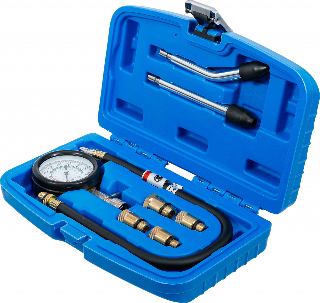 Komplet za merjenje kompresije z analognim manometrom. Razpon: 0–300 psi (0–20 bar). Z ventilom za sprostitev tlaka. Vsebina: manometer s hitrim spojem, cev...