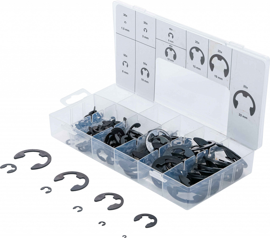 Iz vzmetnega jekla, črno fosfatirano, v plastičnem kovčku. Vsebina: varnostni obročki tipa E v različnih dimenzijah (30 x 1.5 mm, 30 x 3 mm, 40 x 5 mm, 50 x 6 mm, 50 x 10 mm, 40 x 12 mm, 20 x 15 mm, 20 x 19 mm, 20 x 22 mm).