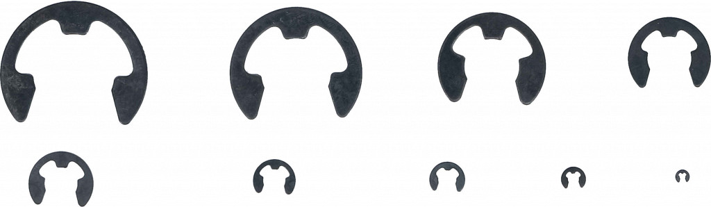 Iz vzmetnega jekla, črno fosfatirano, v plastičnem kovčku. Vsebina: varnostni obročki tipa E v različnih dimenzijah (30 x 1.5 mm, 30 x 3 mm, 40 x 5 mm, 50 x...