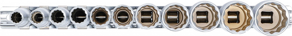 Z rebrasto površino, na letvi. Vsebina: 1 globoka 12-robna nasadka 10 mm (3/8") pogon 5/16", 1 globoka 12-robna nasadka 10 mm (3/8") pogon 11/32", 1 globoka 12-robna nasadka 10 mm (3/8") pogon 3/8", 1 globoka 12-robna nasadka 10 mm (3/8") pogon 7/16", 1 globoka 12-robna nasadka 10 mm (3/8") pogon 1/2", 1 globoka 12-robna nasadka 10 mm (3/8") pogon 9/16", 1 globoka 12-robna nasadka 10 mm (3/8") pogon 5/8", 1 globoka 12-robna nasadka 10 mm (3/8") pogon 11/16", 1 globoka 12-robna nasadka 10 mm (3/8") pogon 3/4", 1 globoka 12-robna nasadka 10 mm (3/8") pogon 13/16", 1 globoka 12-robna nasadka 10 mm (3/8") pogon 7/8".