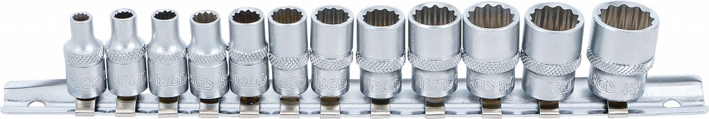 Narebreno, na letvi za nasadne nastavke. Dobava vsebuje: 1 nasadni ključ, 12-robni | 6,3 mm (1/4") pogon | 5/32" (BGS 10870); 1 nasadni ključ, 12-robni | 6,3 mm (1/4") pogon | 3/16" (BGS 10871); 1 nasadni ključ, 12-robni | 6,3 mm (1/4") pogon | 7/32" (BGS 10872); 1 nasadni ključ, 12-robni | 6,3 mm (1/4") pogon | 1/4" (BGS 10873); 1 nasadni ključ, 12-robni | 6,3 mm (1/4") pogon | 9/32" (BGS 10874); 1 nasadni ključ, 12-robni | 6,3 mm (1/4") pogon | 5/16" (BGS 10875); 1 nasadni ključ, 12-robni | 6,3 mm (1/4") pogon | 11/32" (BGS 10876); 1 nasadni ključ, 12-robni | 6,3 mm (1/4") pogon | 3/8" (BGS 10877); 1 nasadni ključ, 12-robni | 6,3 mm (1/4") pogon | 7/16" (BGS 10878); 1 nasadni ključ, 12-robni | 6,3 mm (1/4") pogon | 15/32" (BGS 10879); 1 nasadni ključ, 12-robni | 6,3 mm (1/4") pogon | 1/2" (BGS 10880); 1 nasadni ključ, 12-robni | 6,3 mm (1/4") pogon | 9/16" (BGS 10881).
