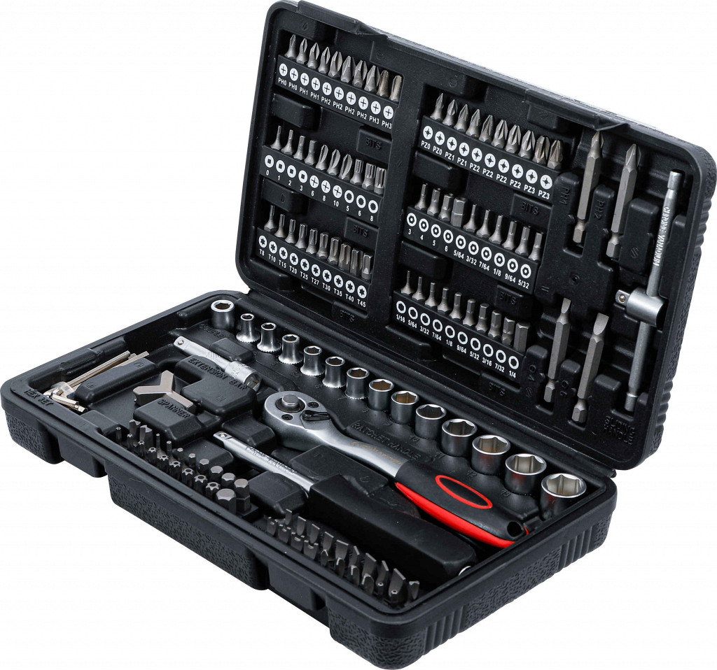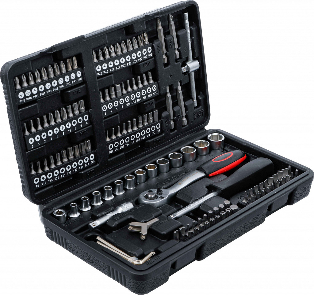 Celovita oprema orodij za mojstre in domače mojstre s svojimi 130 deli ta komplet vtičnic ponuja široko paleto orodij in je primeren za številne aplikacije in montažna delajasno razporejena posamezna delovna bita v praktičnih tirnicah za enostavno odstranjevanje iz ohišjavsako orodje je mogoče najti posamezno in na vnaprej določenem, fiksnem mestuv trdnem plastičnem kovčku za orodje z zaobljenimi vogali.obseg dobave: . 1 reverzibilna zaskočnica | fini zob | 6,3 mm (1/4") (BGS 517)7 L ključ | kratek | notranji šesterokotnik 1,27 mm, 1,5 mm, 2 mm, 2,5 mm, 3 mm, 4 mm, 5 mm.6,3 mm (1/4") zunanji šesterokotni pogon:... 20 bitov | križna reža 2 PH0, 2 PH1, 4 PH2, 2 PH3, 2 PZ0, 2 PZ1, 4 PZ2, 2 PZ39 bita | reža SL 3 mm, 4 mm, 4,5 mm, 5 mm, 5,5 mm, 6 mm, 6,5 mm, 7 mm, 8 mm10 bitov | T-Star (za Torx) T8, T10, T15, T20, T25, T27, T30, T35, T40, T4510 bitov | notranji šesterokotnik 1/16", 5/64", 3/32", 7/46", 1/8", 9/64", 5/32", 3/16", 7/32", 1/4"9 bitov | Notranji šesterokotnik 1,5 mm, 2 mm, 2,5 mm, 3 mm, 4 mm, 5 mm, 5,5 mm, 6 mm, 8 mm4 biti | notranji kvadrat S0, S1, S2, S33 bitov | T-Star 6, 8, 103 bitov | Spline (za XZN) M5, M6, M89 bitov | T-Star (za Torx) T8, T10, T15, T20, T25, T27, T30, T35, T403 biti | Sklopka C1, C2, C36 bitov | notranji šesterokotnik, zaščiten pred nedovoljenimi posegi 5/64", 3/32", 7/64", 1/8", 9/64", 5/32"4 biti | Ključ 4, 6, 8, 104 bitov | 3-krilni 1, 2, 3, 46 bitov | Notranji šesterokotnik, zaščiten pred nedovoljenimi posegi 2 mm, 2,5 mm, 3 mm, 4 mm, 5 mm, 6 mm4 biti | dolžina 50 mm | navzkrižna reža PH1, PH2, PZ1, PZ21 nastavljalnik s kljuko.6,3 mm (1/4") pogon:... 1 podaljšek | 50 mm1 bitni adapter z zadrževalno kroglo | Notranji šesterokotnik 6,3 mm (1/4")13 vtičnic, šesterokotnik | 4 mm, 4,5 mm, 5 mm, 5,5 mm, 6 mm, 7 mm, 8 mm, 9 mm, 10 mm, 11 mm, 12 mm, 13 mm, 14 mm.zunanji kvadrat 6,3 mm (1/4"). 1 ročaj vrtilnika | 150 mm1 drsni ročaj