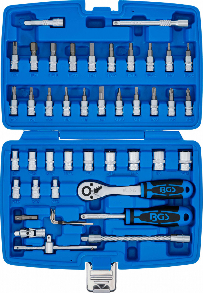 Obsežno opremljeno za zahtevne mehanike in domače mojstre, z šestkotnimi nasadnimi ključi v palčnih velikostih in kratko različico ter nastavki z različnimi izhodnimi profili, visokokakovostna fino zobata reverzibilna raglja z 90 zobmi, vstavljen reverzibilni vzvod, ergonomski dvokomponentni ročaj in gumb za hitro sprostitev za hitre menjave orodij, vsebuje med drugim raznolike delovne elemente, kot so podaljški, drsni ročaj, ročaj z ragljo in univerzalni sklep, za pokrivanje različnih vijačnih aplikacij, tudi v težko dostopnih območjih, jasna razporeditev za hitro najdenje želenega vijačnega orodja, varno in urejeno shranjevanje v ojačanem kovčku, jasna razporeditev različnih nasadnih ključev in nastavkov za hitro najdenje potrebne velikosti, z narebrjenostjo, nasadni ključi, podaljški, reverzibilna raglja, univerzalni sklep in ročaj z ragljo iz kromovanadijevega jekla, nastavki iz visokokakovostnega kromovanadijevega jekla (S2), 1 nasadni ključ, šestkotni, 6,3 mm (1/4") pogon, 5/32" (BGS 10650), 1 nasadni ključ, šestkotni, 6,3 mm (1/4") pogon, 3/16" (BGS 10651), 1 nasadni ključ, šestkotni, 6,3 mm (1/4") pogon, 7/32" (BGS 10652), 1 nasadni ključ, šestkotni, 6,3 mm (1/4") pogon, 1/4" (BGS 10653), 1 nasadni ključ, šestkotni, 6,3 mm (1/4") pogon, 9/32" (BGS 10654), 1 nasadni ključ, šestkotni, 6,3 mm (1/4") pogon, 5/16" (BGS 10655), 1 nasadni ključ, šestkotni, 6,3 mm (1/4") pogon, 11/32" (BGS 10656), 1 nasadni ključ, šestkotni, 6,3 mm (1/4") pogon, 3/8" (BGS 10657), 1 nasadni ključ, šestkotni, 6,3 mm (1/4") pogon, 7/16" (BGS 10658), 1 nasadni ključ, šestkotni, 6,3 mm (1/4") pogon, 1/2" (BGS 10659), 1 nasadni ključ, šestkotni, 6,3 mm (1/4") pogon, 15/32", 1 nasadni ključ, šestkotni, 6,3 mm (1/4") pogon, 9/16", 1 nastavek, 6,3 mm (1/4") pogon, notranji šestkotnik 3/8" (BGS 2748), 1 nastavek, 6,3 mm (1/4") pogon, notranji šestkotnik 5/16" (BGS 2747), 1 nastavek, 6,3 mm (1/4") pogon, notranji šestkotnik 9/32" (BGS 2746), 1 nastavek, 6,3 mm (1/4") pogon, notranji šestkotnik 1/4" (BGS 2745), 1 nastavek, 6,3 mm (1/4") pogon, notranji šestkotnik 7/32" (BGS 2744), 1 nastavek, 6,3 mm (1/4") pogon, notranji šestkotnik 3/16" (BGS 2743), 1 nastavek, 6,3 mm (1/4") pogon, notranji šestkotnik 5/32" (BGS 2742), 1 nastavek, 6,3 mm (1/4") pogon, notranji šestkotnik 1/8" (BGS 2741), 1 nastavek, 6,3 mm (1/4") pogon, notranji šestkotnik 3/32" (BGS 2740), 1 nastavek, 6,3 mm (1/4") pogon, T-star (za Torx) T10 (BGS 2590), 1 nastavek, 6,3 mm (1/4") pogon, T-star (za Torx) T15 (BGS 2591), 1 nastavek, 6,3 mm (1/4") pogon, T-star (za Torx) T20 (BGS 2592), 1 nastavek, 6,3 mm (1/4") pogon, T-star (za Torx) T25 (BGS 2593), 1 nastavek, 6,3 mm (1/4") pogon, T-star (za Torx) T30 (BGS 2595), 1 nastavek, 6,3 mm (1/4") pogon, T-star (za Torx) T40 (BGS 2596), 1 nastavek, 6,3 mm (1/4") pogon, reža SL 4 mm (BGS 2493), 1 nastavek, 6,3 mm (1/4") pogon, reža SL 5,5 mm (BGS 2494), 1 nastavek, 6,3 mm (1/4") pogon, reža SL 7 mm (BGS 2496), 1 nastavek, 6,3 mm (1/4") pogon, križni PZ1 (BGS 2490), 1 nastavek, 6,3 mm (1/4") pogon, križni PZ2 (BGS 2491), 1 nastavek, 6,3 mm (1/4") pogon, križni PZ3 (BGS 2492), 1 univerzalni sklep, 6,3 mm (1/4") (BGS 250), 1 podaljšek, 6,3 mm (1/4"), 50 mm (BGS 2336), 1 podaljšek, 6,3 mm (1/4"), 100 mm (BGS 2335), 1 gibljiv podaljšek, 6,3 mm (1/4"), 150 mm (BGS 2320), 1 adapter za nastavke z ragljo, zunanji šestkotnik 6,3 mm (1/4") - zunanji kvadrat 6,3 mm (1/4"), 30 mm (BGS 8202), 1 drsni ročaj, zunanji kvadrat 6,3 mm (1/4") (BGS 276), 1 ročaj z ragljo, zunanji kvadrat 6,3 mm (1/4"), 150 mm (BGS 216), 1 reverzibilna raglja, fino zobata, 6,3 mm (1/4") (BGS 630), 1 set šestkotnih ključev, notranji šestkotnik 1,25 - 1,5 - 2 - 2,5 - 3 mm