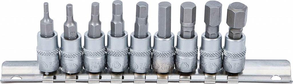 Knurliran, na letvi za nasadne nastavke. Dobava vsebuje: bit nastavke, pogon 6,3 mm (1/4"), notranji šesterokotni: 3/32" – 1/8" – 5/32" – 3/16" – 7/32" –...