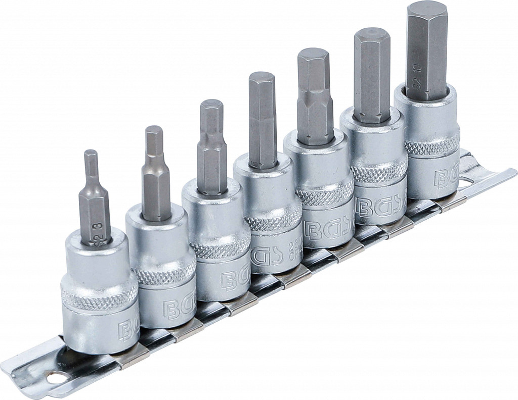Zarezan oprijem, na nosilnem traku za nastavke, vključuje: nasadni nastavki 10 mm (3/8") pogon, notranji šesterokotnik 3 - 4 - 5 - 6 - 7 - 8 - 10 mm.