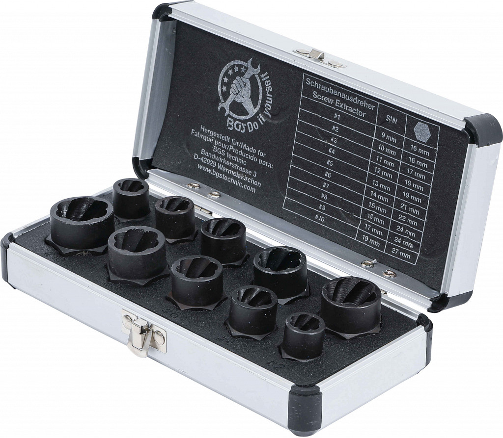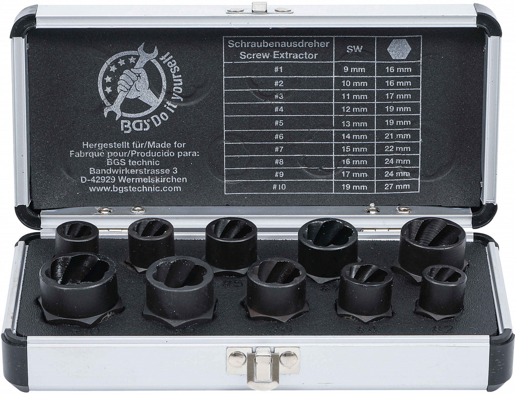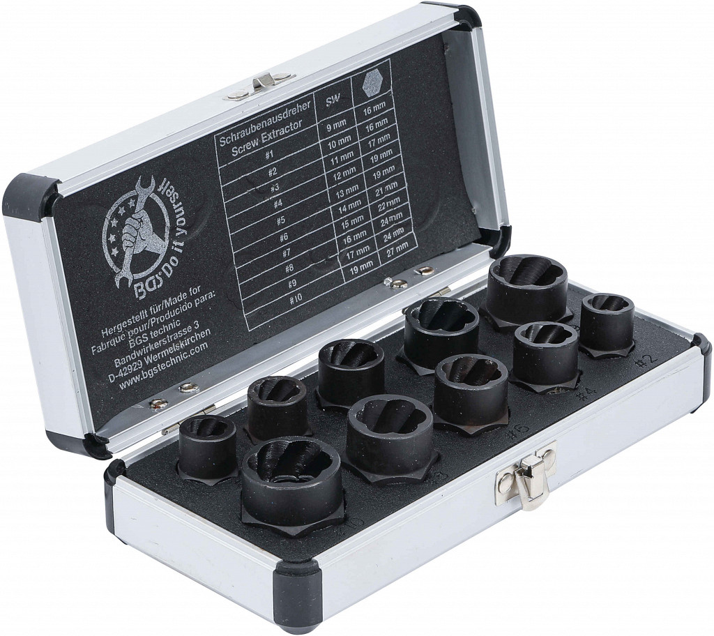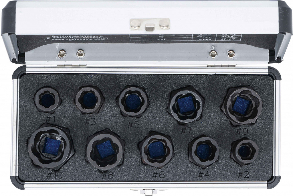 Primeren za ohlapljanje poškodovanih vijakov in matic, inovativen tip vrtenja se sam zareže v glavo poškodovanega vijaka/matice in omogoča varno ohlapljanje, z dodatnim zunanjim šestkotnikom na pogonu, v aluminijastem ohišju, obseg dobave: nasadni ključi 10 mm (3/8") pogon: 9 mm, 10 mm, 11 mm, 12 mm, 13 mm, 14 mm, 15 mm, 16 mm, 17 mm in 19 mm.
