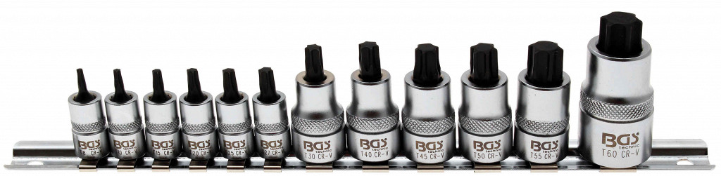 Set bit nastavkov Torx na vodilu, narebreni, obseg dobave: 6,3 mm pogon T8–T27, 3/8" pogon T30–T55, 1/2" pogon T60