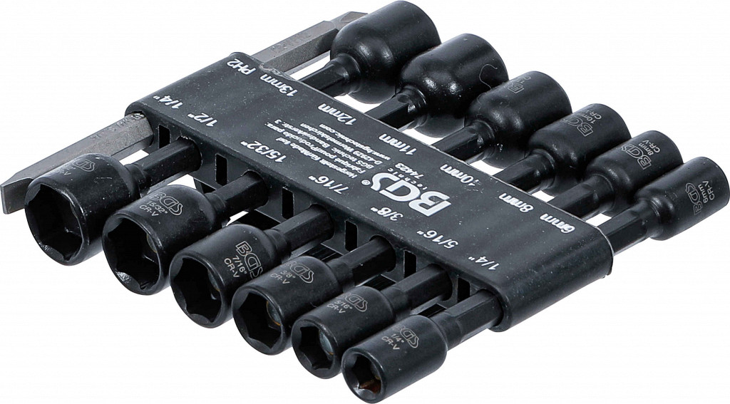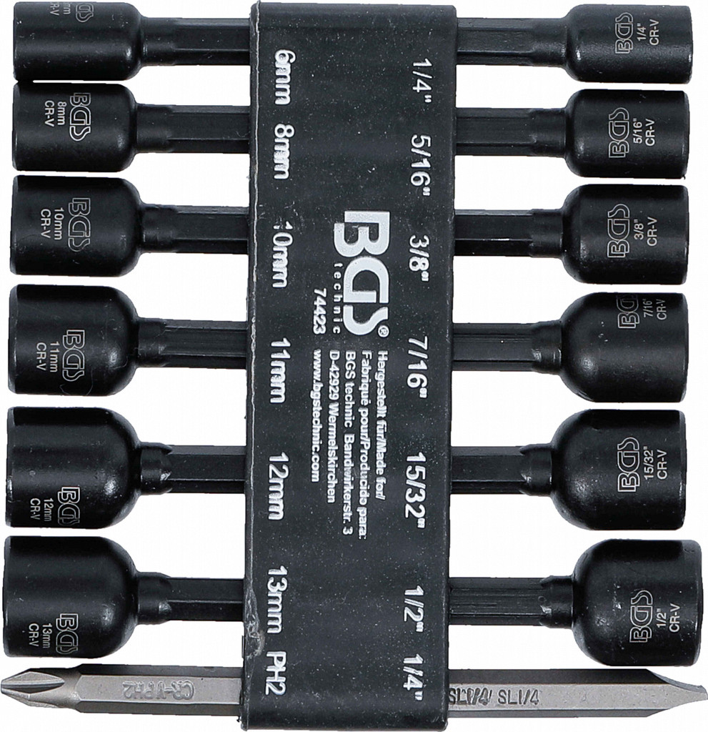 Za privijanje in odvijanje metričnih šesterokotnih vijakov brez poškodb za uporabo z vrtalniki in akumulatorskimi izvijači z močnim trajnim magnetom za enostavno nanašanje vijakovmetričnih in palčnih velikostiv praktičnem plastičnem držalu s sponko za pas.obseg dobave:... 1 vtičnica, šesterokotna | za električne vrtalnike | Pogon 6,3 mm (1/4") | Vtičnica 6 mm1, šesterokotna | za električne vrtalnike | Pogon 6,3 mm (1/4") | 8 mm1 vtičnica, šesterokotnik | za električne vrtalnike | Pogon 6,3 mm (1/4") | 10 mm1 vtičnica, šesterokotnik | za električne vrtalnike | Pogon 6,3 mm (1/4") | 11 mm1 vtičnica, šesterokotnik | za električne vrtalnike | Pogon 6,3 mm (1/4") | 12 mm1 vtičnica, šesterokotnik | za električne vrtalnike | Pogon 6,3 mm (1/4") | 13 mm1 vtičnica, šesterokotnik | za električne vrtalnike | Pogon 6,3 mm (1/4") | 1/4"1 vtičnica, šesterokotnik | za električne vrtalnike | Pogon 6,3 mm (1/4") | 5/16"1 vtičnica, šesterokotnik | za električne vrtalnike | Pogon 6,3 mm (1/4") | 3/8"1 vtičnica, šesterokotnik | za električne vrtalnike | Pogon 6,3 mm (1/4") | 7/16"1 vtičnica, šesterokotnik | za električne vrtalnike | Pogon 6,3 mm (1/4") | 15/32"1 vtičnica, šesterokotnik | za električne vrtalnike | Pogon 6,3 mm (1/4") | 1/2"1 bit | dolžina 50 mm | 6,3-milimetrski (1/4-palčni pogon) | navzkrižna reža PH 21 bitov | dolžina 50 mm | 6,3-milimetrski (1/4-palčni pogon) | reža SL 1/4"