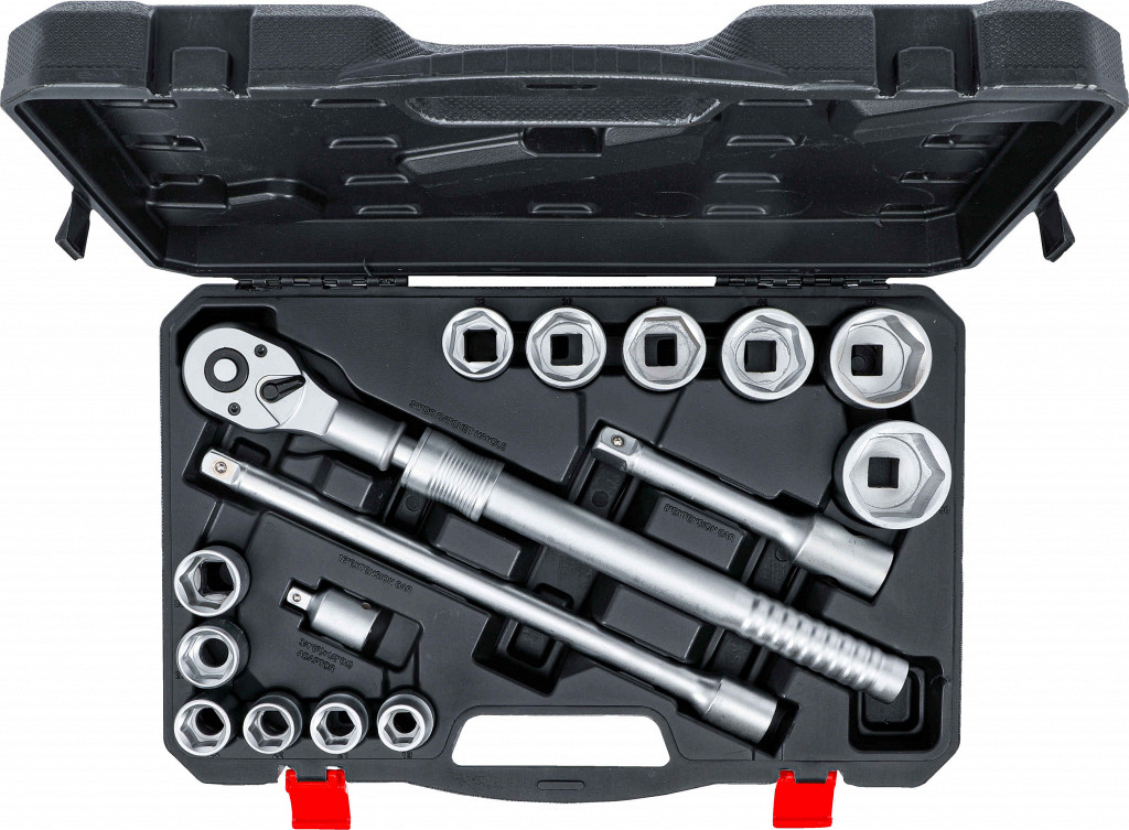 Idealen za zmogljivo uporabo na gospodarskih vozilih, traktorjih in strojihkompaktni komplet z 12 vtičnicami od 19 do 50 mm, 2 podaljškoma 200 in 400 mm in adapterjem za vtičnico od 20 mm (3/4") do 12,5 mm (1/2") s teleskopsko reverzibilno zaskočnico za prenos moči z nizkim vnosom moči vrtenje desno/levo, ki ga je mogoče preklopiti z ročicosSprostitev z gumbomTeleskopska gred, ki jo je mogoče zakleniti od 510 do 760 mm, Robustno plastično ohišje.. Izhodni profil: Šesterokotni profil pogona: Notranji kvadratni pogon Velikost profila, palec: 3/4 "Velikost pogonskega profila, metrika: 20 mmMaterial: ogljikovo jekloPovršinska obdelava: Satensko kromiranozobje v zaskočni glavi: 24.Obseg dobave:. 1 reverzibilna zaskočnica, raztegljiva, zunanji kvadratni pogon 20 mm (3/4"), dolžina 510 - 760 mm12 vtičnic, pogon 20 mm (3/4"), šesterokotnik 19 - 21 - 22 - 24 - 27 - 30 - 32 - 36 - 38 - 41 - 46 - 50 mm2 podaljšek, zunanji/notranji kvadratni 20 mm (3/4"), dolžina 200 in 400 mm1 adapter za vtičnico, notranji kvadratni 20 mm (3/4") / zunanji kvadratni 12,5 mm (1/2")