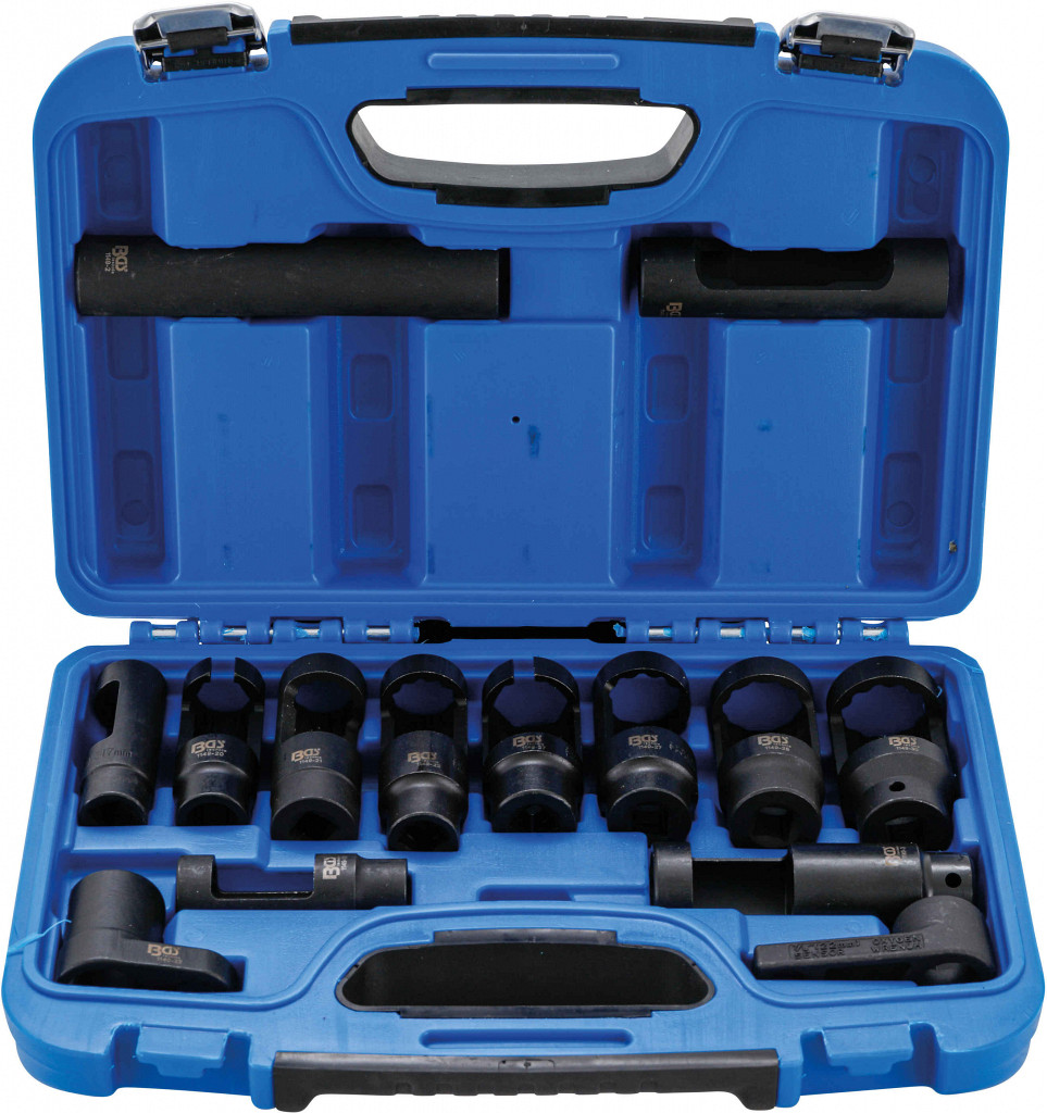 Komplet nasadnih ključev za senzorje kisika: 12,5 mm (1/2") gonilo, 30 mm, 12-robni, dolžina 80 mm (za Bosch, General Motors, Mercedes-Benz); 12,5 mm (1/2") gonilo, 27 mm šesterokotni, dolžina 80 mm (za vsa vozila); 12,5 mm (1/2") gonilo, 28 mm, 12-robni, dolžina 80 mm (za Volvo, Scania, tovorna vozila); 12,5 mm (1/2") gonilo, 21 mm, 12-robni, dolžina 85 mm (za Ford, VAG); 12,5 mm (1/2") gonilo, 27 mm, 12-robni, dolžina 85 mm (za BMW, Fiat, Ford, Peugeot); 12,5 mm (1/2") gonilo, 22 mm, 12-robni, dolžina 80 mm (za vsa vozila); 12,5 mm (1/2") gonilo, 27 mm, 12-robni, dolžina 110 mm (za PSA); 12,5 mm (1/2") gonilo, 22 mm, 12-robni, dolžina 110 mm (za Audi, BMW, Mercedes-Benz, VW, Volvo); 12,5 mm (1/2") gonilo, 22 mm, 12-robni, dolžina 150 mm (za BMW); 12,5 mm (1/2") gonilo, 20 mm šesterokotni, dolžina 80 mm, z zarezo (za vsa vozila); 12,5 mm (1/2") gonilo, 19 mm, 12-robni, dolžina 80 mm (za VW, Audi, Seat); 12,5 mm (1/2") gonilo, 17 mm, 12-robni, dolžina 80 mm (za BMW, Mercedes-Benz, Renault); 12,5 mm (1/2") gonilo, 22 mm, 12-robni, dolžina 50 mm, zamaknjeno gonilo (za vsa vozila); 10 mm (3/8") gonilo, 22 mm šesterokotni, dolžina 30 mm, zamaknjeno gonilo (za vsa vozila).