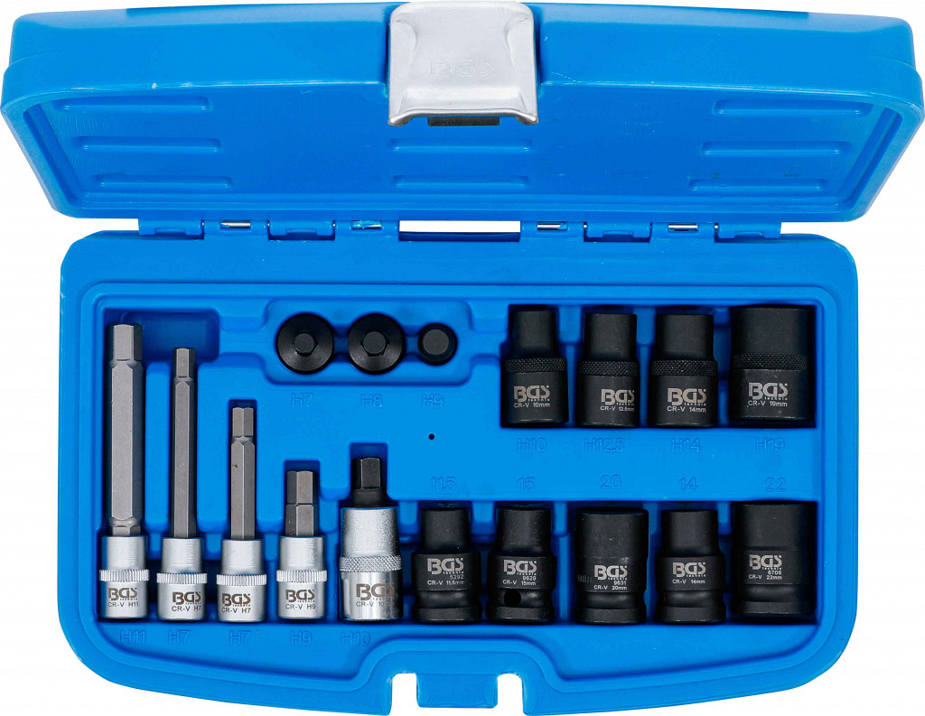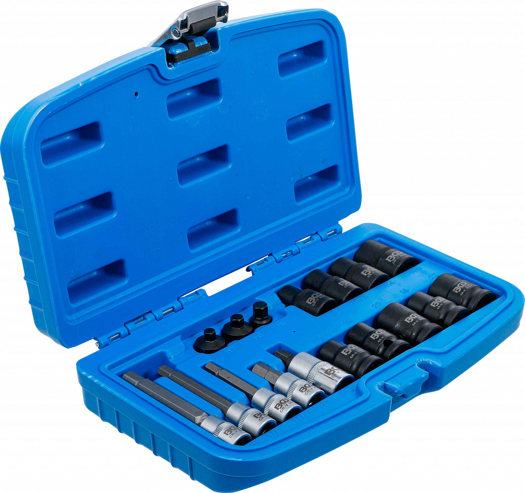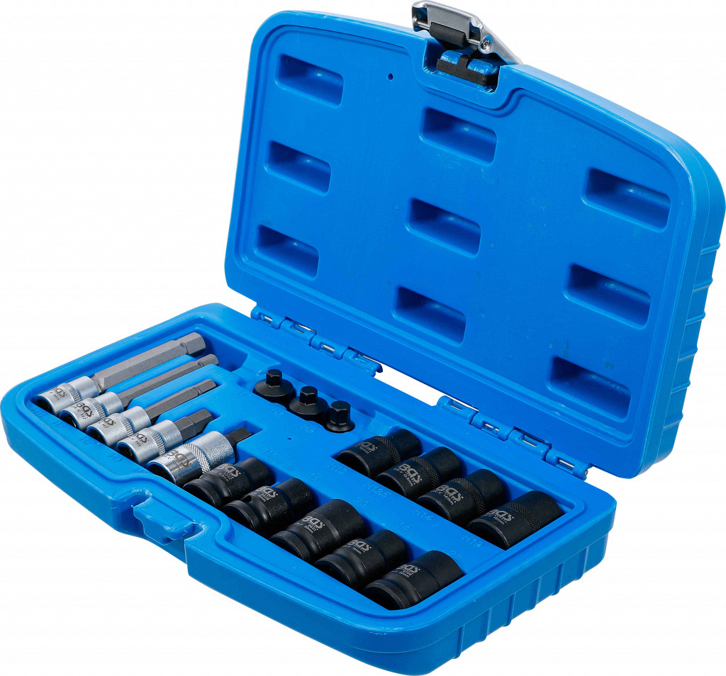 Za demontažo zavornih čeljusti pri zamenjavi zavornih ploščicposebni profili za sprostitev vijačnih spojev ločenih zavornih čeljustiprimerno za modele vozil naslednjih proizvajalcev:Audi, Alfa Romeo, BMW, Chrysler, Ford, Mercedes-Benz, MINI, Porsche, Saab, Volkswagen, Vauxhall.obseg dobave:. 1 vtičnica za udarne bite | 6,3-milimetrski (1/4-palčni pogon) | notranji šesterokotnik 9 mm | dolžina 20 mm za Mercedes-Benz ML320 in drugo1 udarno glavo | 10-milimetrski (3/8-palčni pogon) | notranji šesterokotnik 7 mm | dolžina 24 mm za Mercedes-Benz razred C, Audi TT (2007-), A4 (2001-), A6 (2005-), A8 (2003-) in druge1 vtičnica za udarne bite | 10-milimetrski (3/8-palčni pogon) | notranji šesterokotnik 8 mm | dolžina 24 mm za Mercedes-Benz razred C, Audi TT (2007-), A4 (2001-), A6 (2005-), A8 (2003-) in druge1-bitna vtičnica | 10-milimetrski (3/8-palčni pogon) | notranji šesterokotnik 9 mm | dolžina 50 mm za vtičnico Mercedes-Benz, BMW, Jaguar XF1 | 10-milimetrski (3/8-palčni pogon) | notranji šesterokotnik 7 mm | dolžina 72 mm za BMW 3 (E36), 5, Ford Mondeo, Fiesta, Alfa Romeo, Vauxhall, Volkswagen, SAAB, Chrysler, BMW MINI1 bitna vtičnica | 10-milimetrski (3/8-palčni pogon) | notranji šesterokotnik 7 mm | dolžina 92 mm za BMW 3 (E36), 5, Ford Mondeo, Fiesta, Alfa Romeo, Vauxhall, Volkswagen, SAAB, Chrysler, BMW MINI1 bitna vtičnica | 10-milimetrski (3/8-palčni pogon) | notranji šesterokotnik 11 mm | dolžina 100 mm za Mercedes ML, Ford Focus, Edge &. Dizelski injektorji1 bitna vtičnica | 12,5-milimetrski (1/2-palčni pogon) | notranji šesterokotnik 10 mm | dolžina 55 mm1 posebna vtičnica | za Audi S5 / Q5 zavorne čeljusti (BGS 6706)1 vtičnica zavorne čeljusti | 10-točkovna | za VAG in Porsche | 11,5 mm (BGS 5292)1 vtičnica zavorne čeljusti | 10-točkovna | za VAG in Porsche | 15 mm (BGS 9629)1 vtičnica zavorne čeljusti | 10-točkovna | za VAG in Porsche | 20 mm (BGS 9631)1 vtičnica | 12,5-milimetrski (1/2-palčni pogon) | 7-krakovna 14 mm | dolžina 38 mm za vtičnico Audi A5, A6L, Q5, Q7 (2017-)1 | 12,5-milimetrski (1/2-palčni pogon) | peterokotnik 10 mm | dolžina 38 mm1 vtičnica | 12,5-milimetrski (1/2-palčni pogon) | peterokotnik 12,5 mm | dolžina 38 mm1 vtičnica | 12,5-milimetrski (1/2-palčni pogon) | peterokotnik 14 mm | dolžina 38 mm1 vtičnica | 12,5-milimetrski (1/2-palčni pogon) | peterokotnik 19 mm | dolžina 38 mm