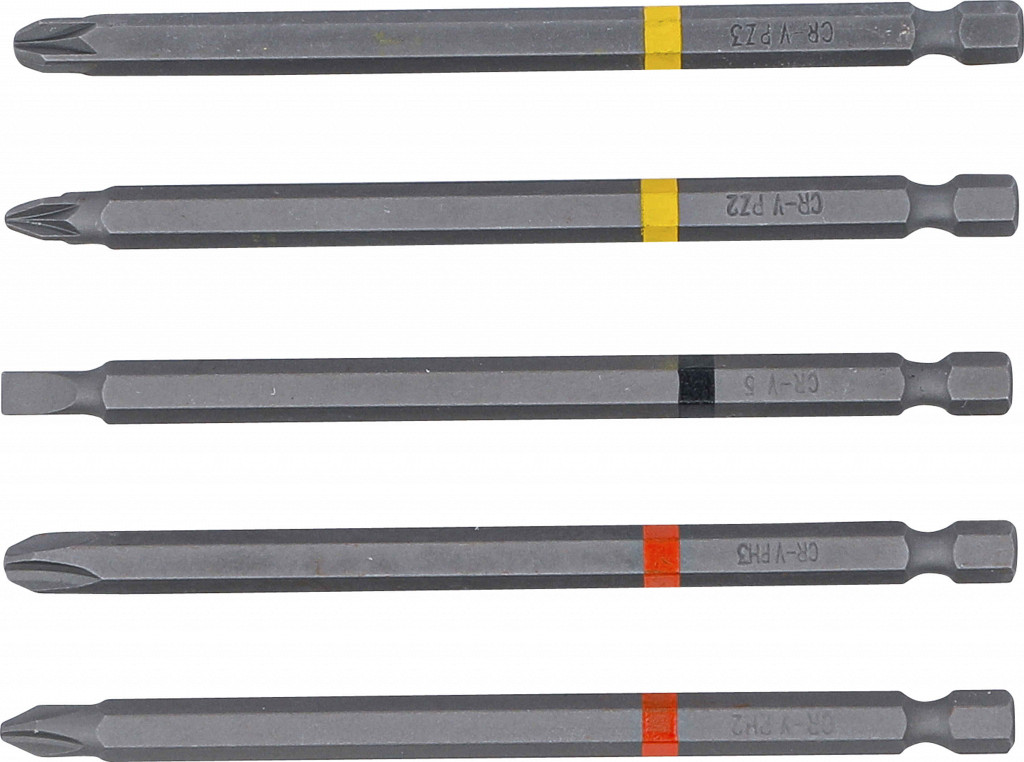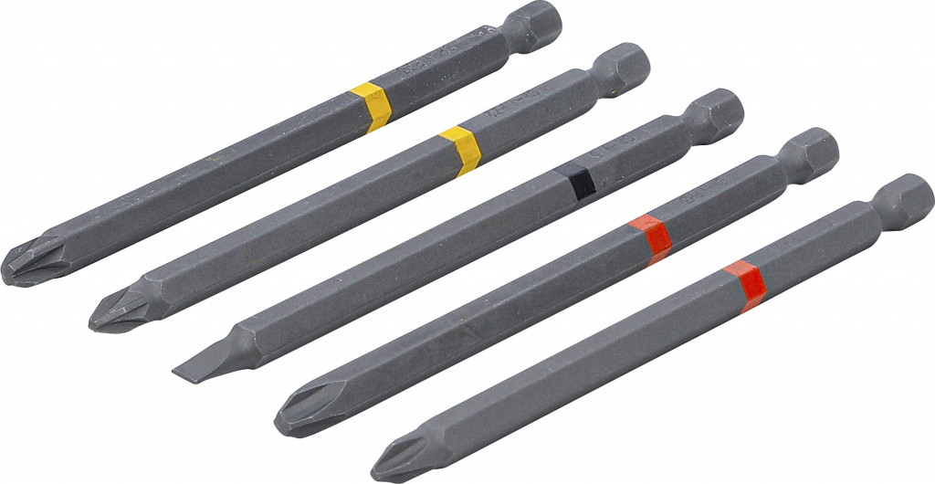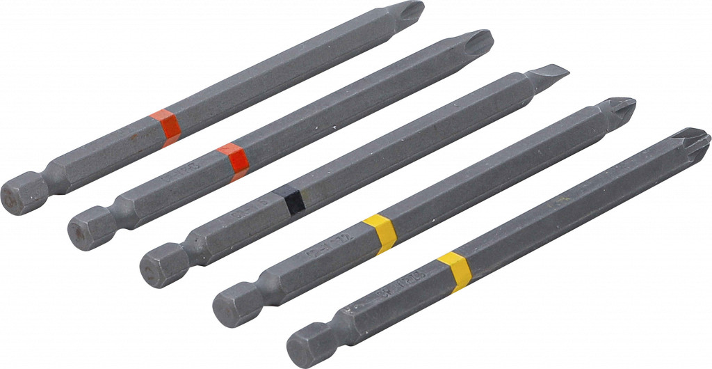 Izredno dolgi nastavki, idealni za globoko ležeče vijake, s sistemom barvnega označevanja profilov. Vsebuje dolge nastavke 110 mm: PZ2, PZ3, PH2, PH3 in SL5.