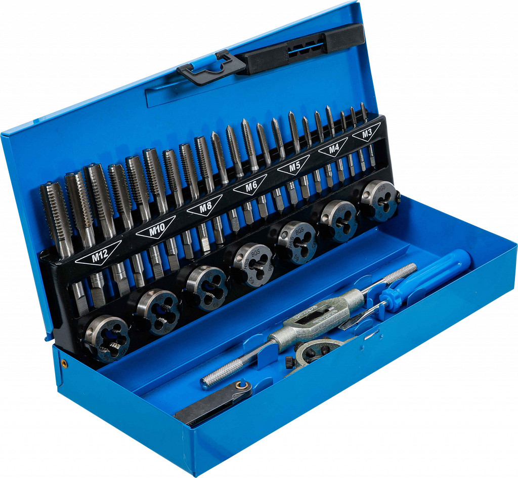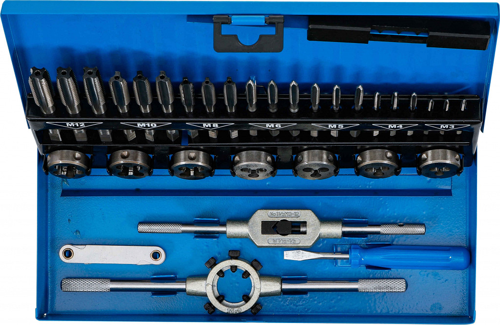 Vsebina: 7 kompletov navojnih svedrov DIN 352, 7 navojnih ploščic DIN 223 (25 x 9 mm): M3 x 0.5 - M4 x 0.7 - M5 x 0.8 - M6 x 1.0 - M8 x 1.25 - M10 x 1.5 - M12 x 1.75, 1 nosilec za navojne ploščice 25 x 9 mm, 1 navojno držalo (DIN 1814) št. 1, 1 merilo za navojne korake, 1 izvijač, v kovinskem kovčku