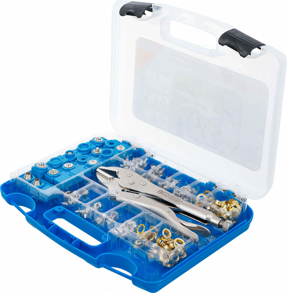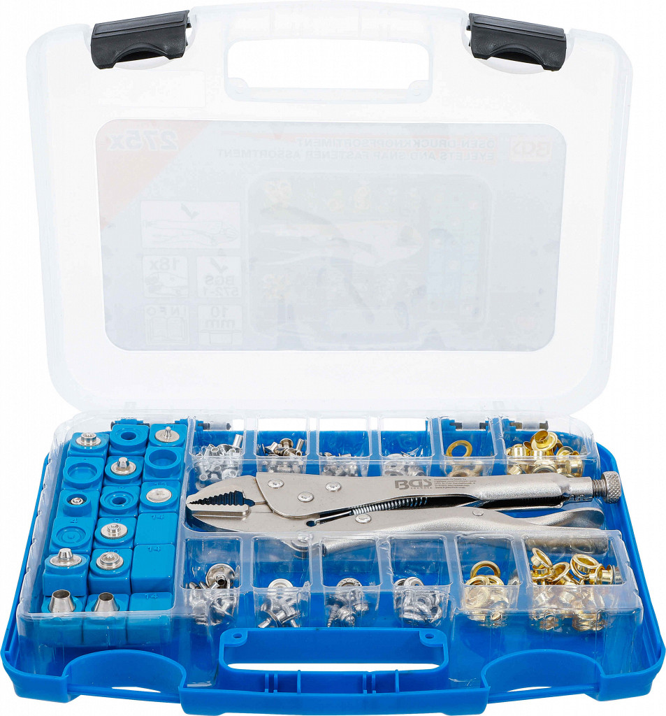 V plastični škatli. Vsebina: zaklepne klešče, 18 izmenljivih nastavkov, neti različnih velikosti, 10 mm net za kovičenje in vijačenje.