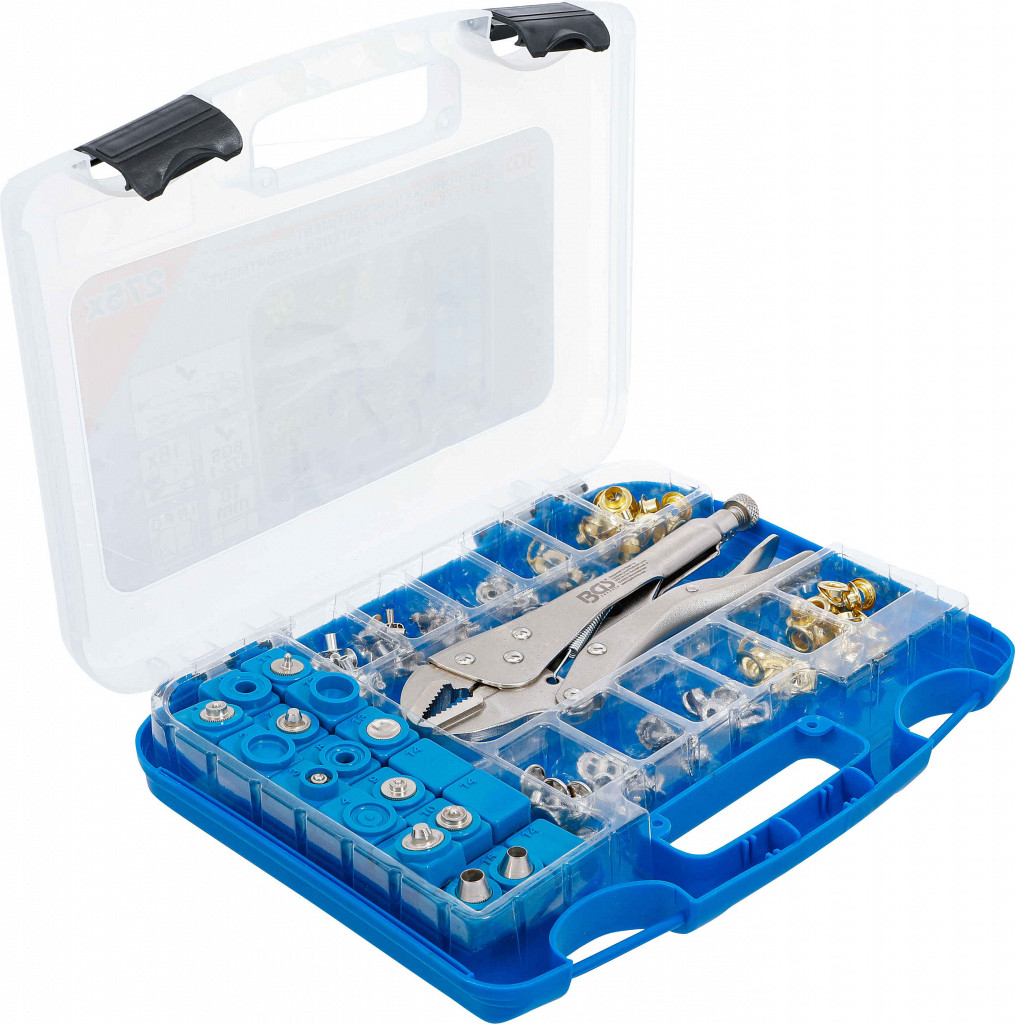 V plastični škatli. Vsebina: zaklepne klešče, 18 izmenljivih nastavkov, neti različnih velikosti, 10 mm net za kovičenje in vijačenje.