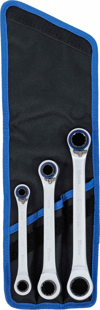3 raglje s po 4 velikostmi v enem. Dvosmerne, fino zobate (72 zob), pakirane v etuiju. Vključujejo velikosti: 8x9 - 10x11 mm, 12x13 - 14x15 mm, 16x17 - 18x19 mm.
