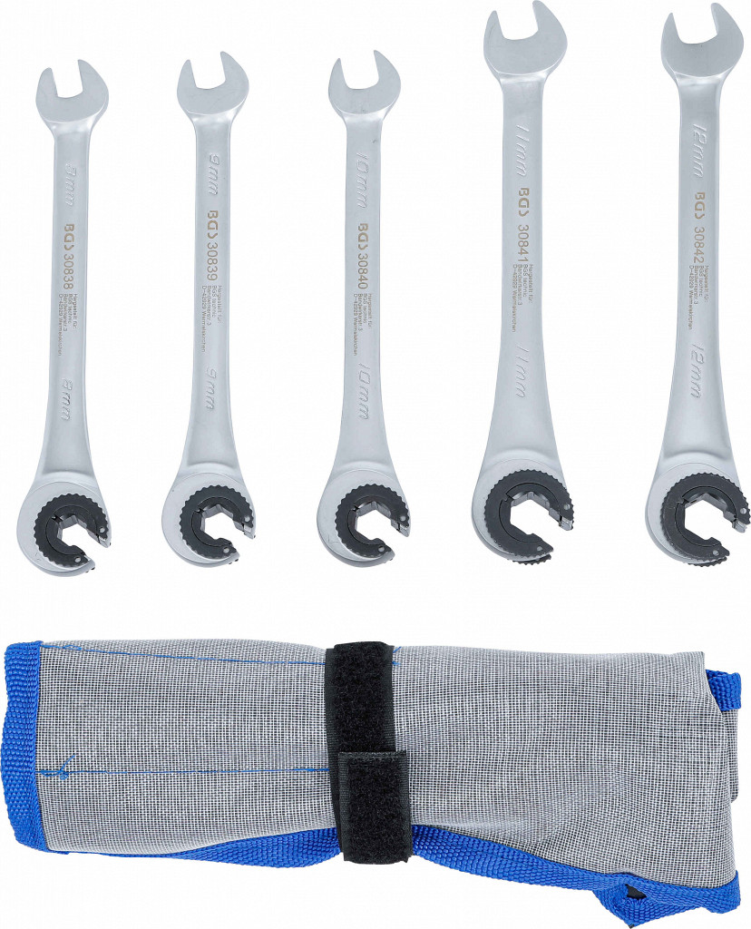 V tetron etuiju. Obseg dobave: 1 kombinirani ključ z rageljno funkcijo 8 mm (BGS 30838). 1 kombinirani ključ z rageljno funkcijo 9 mm (BGS 30839). 1 kombinirani ključ z rageljno funkcijo 10 mm (BGS 30840). 1 kombinirani ključ z rageljno funkcijo 11 mm (BGS 30841). 1 kombinirani ključ z rageljno funkcijo 12 mm (BGS 30842).