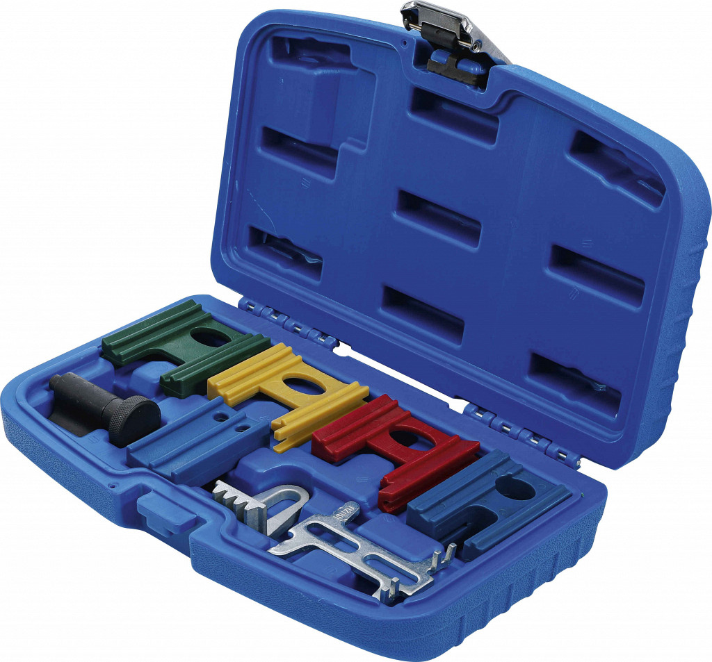 vsestranski set za številne modele. Vsebina: orodje za blokado odmičnih gredi za Opel Calibra, Omega, Sintra, Vectra 1.8 / 2.0 (OEM KM-852, 18G1570); orodje za blokado odmičnih gredi za Opel Calibra, Omega, Sintra, Vectra 1.4 / 1.6 (OEM KM-853); orodje za blokado desne odmične gredi za Saab 900 2.5/3.0 in Opel Calibra, Sintra, Vectra 2.5/3.0 (OEM KM-800-2); orodje za blokado leve odmične gredi za Saab 900 2.5/3.0 in Opel Calibra, Sintra, Vectra 2.5/3.0 (OEM KM-800-1); orodje za blokado zobatega jermena na ročični gredi pri TDI motorjih za VW, Škoda, Seat, Ford (VAG T10050); orodje za blokado vztrajnika za Citroën, Fiat, Peugeot (OEM 153A, 6012T, 9765.54); orodje za blokado vztrajnika za Isuzu 1.5 in 1.7 dizel, Opel 1.6/1.7 dizel ter Opel 1.2/1.4/1.6/1.8/2.0 OHC bencinske motorje (OEM KM-517-B).
