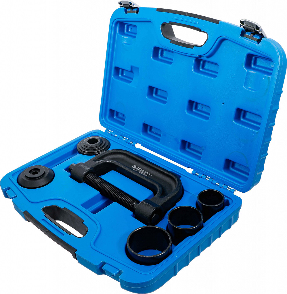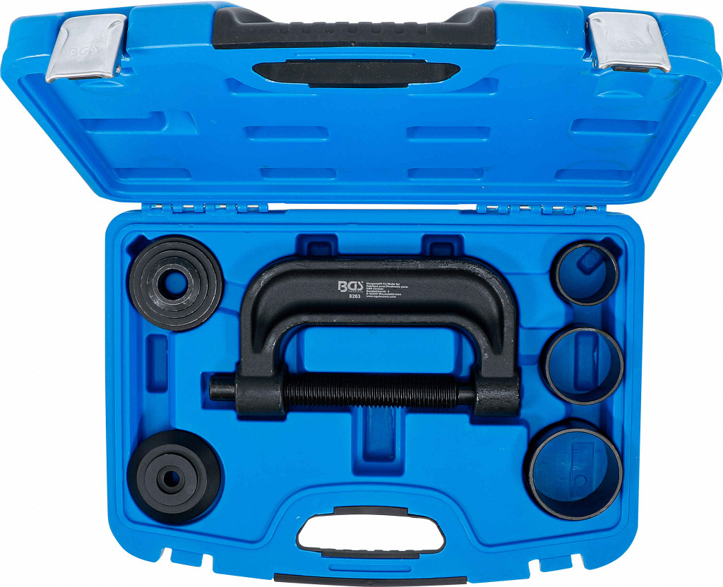 Set za menjavo krogličnih zglobov, križnih zglobov in vijakov sidrišča zavor. Primeren za SUV, kombije in vozila z večjimi deli. Vsebina: stopničaste plošče, C-okvir z vretenom, tulec Ø 44.4/50.8 mm, tulec Ø 56.6/63.4 mm, tulec Ø 69/76.1 mm.