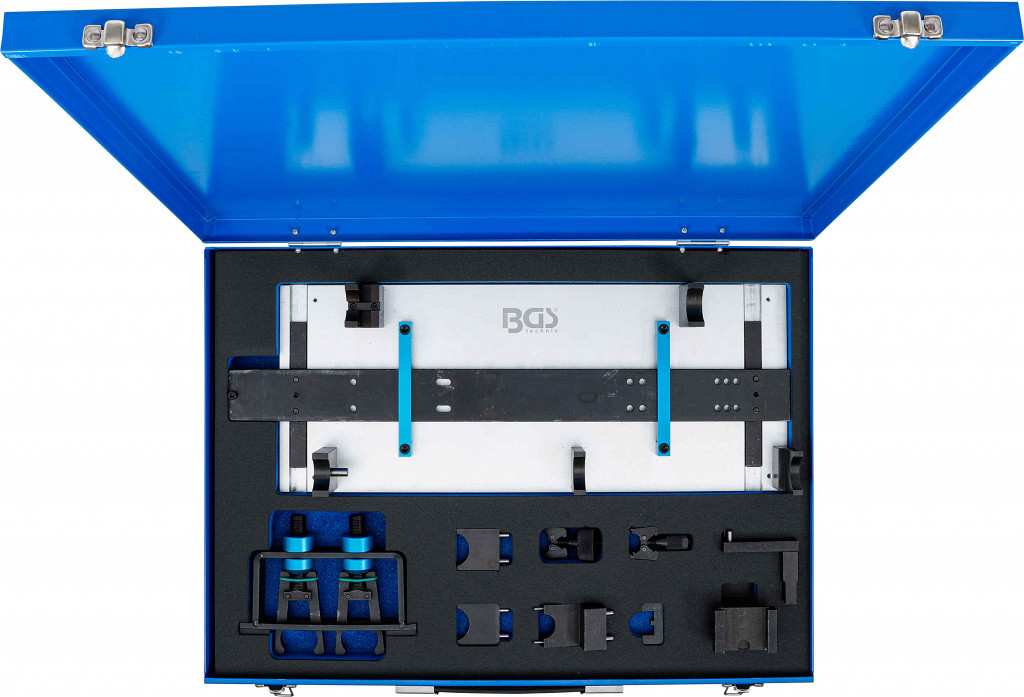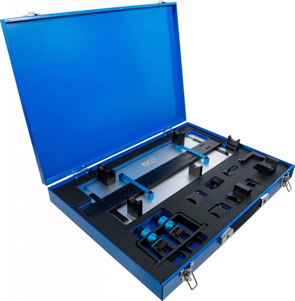 Orodje za namestitev odmičnih gredi v pravilen položaj, potrebno pri menjavi ali montaži, brez njega lahko pride do poškodb ležajnega mostu in glave motorja, primerno za vozila Audi, Porsche, Seat, Škoda, Volkswagen z dizelskimi motorji TDI CR od 2003 dalje (1.2–4.2 l), z obsežno listo motornih kod, vsebuje montažno napravo, vpenjalne sponke in blokade OEM T40094–T40096.