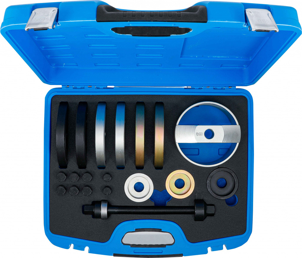Univerzalni set za montažo ležajev pri vozilih Audi, VW, Seat in Škoda, primeren za 62, 66 in 72 mm ležaje, omogoča montažo neposredno na vozilu, hitro in varno rokovanje, možnost uporabe s stiskalnico, vključen univerzalni pritiskalec, nastavki, vreteno in pritrdilni vijaki.