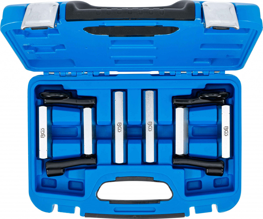 Enoročno orodje za stiskanje zavornih batkov. Širina čeljusti 135–175 mm, šesterokotna os 22 mm, 3 dolžine vreten za različne modele vozil.