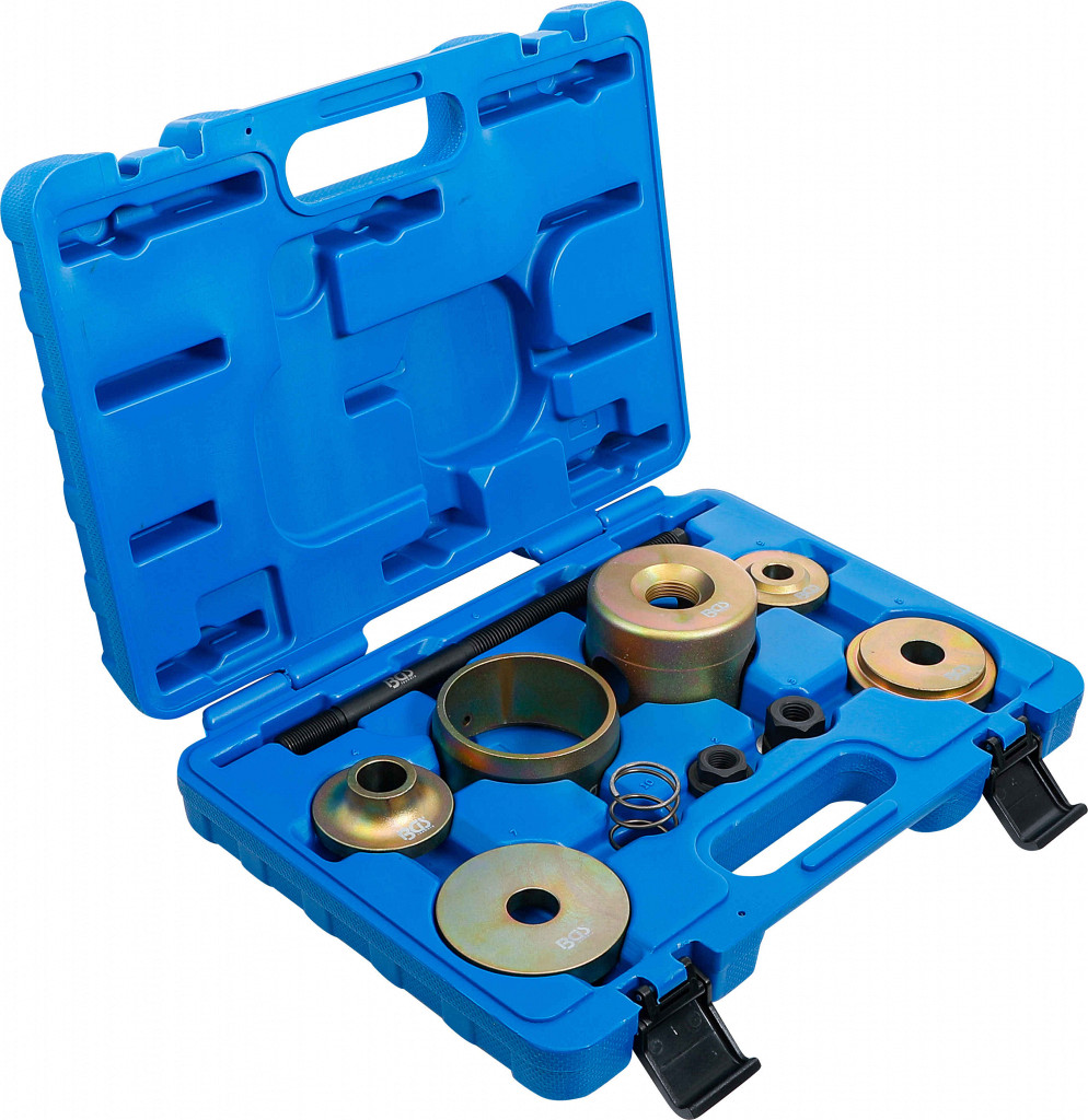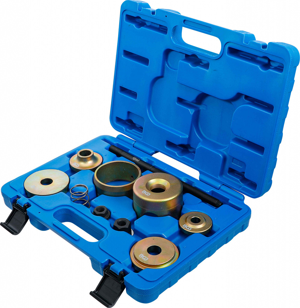 Orodje za menjavo zadnjih kolesnih ležajev brez demontaže. Vsebina: centrirna plošča z diskom in vzmetjo, 2 tlačna diska, adapter obroč, vreteno z matico M14...