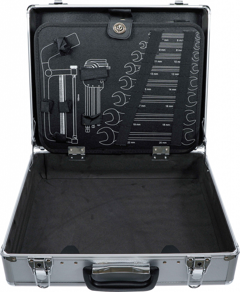 Aluminijasto orodje v kovčku, zložljivo dno, zaklepanje. Obseg: nož za rezanje 155 mm z 18 mm rezilom + 10 rezervnih rezil, nastavljivi ključ 200 mm, vodne...