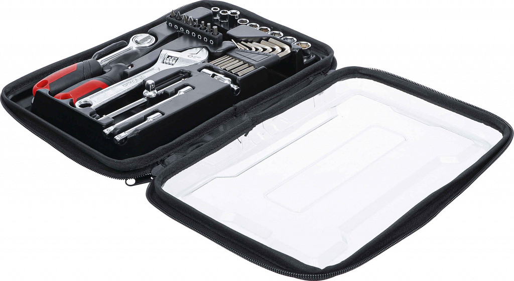 Set v zložljivi torbi z zadrgo in prozornim pokrovom: nastavljiv ključ 150 mm (odprtina 19 mm), reverzibilna raglja 1/4", kardanski zglob 1/4", ročaj 150 mm 1/4", drsni ročaj 110 mm 1/4", podaljška tipa wobble 50 in 100 mm, 8 nasadnih ključev 1/4" 5–13 mm, 8 imbus L-ključev 1.5–6 mm, adapter za bite 1/4", 8 bitov PZ0–PZ3 in H2–H4.